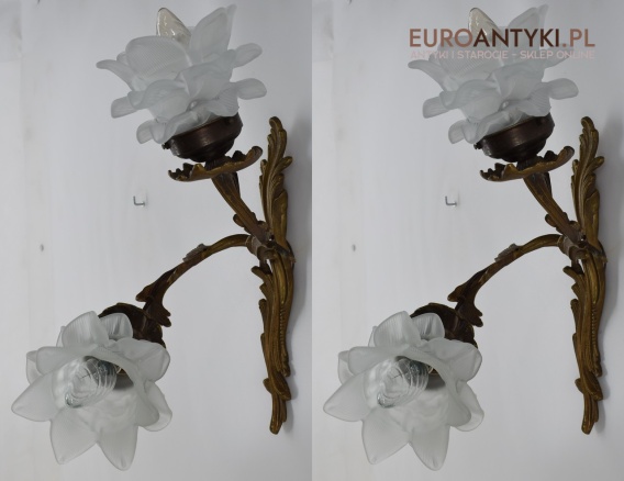 Antyczne kinkiety barok / rokoko z lat 30. – masywny brąz, florystyczne klosze, para XL