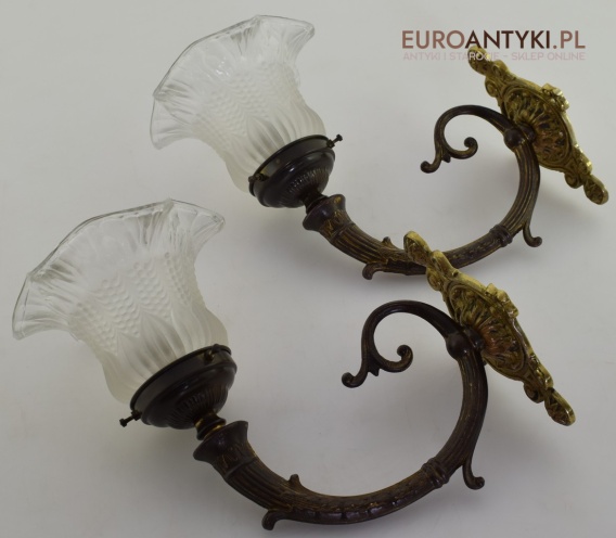 Oryginalne francuskie kinkiety secesyjne – mosiądz patyna, szkło, lata 30.