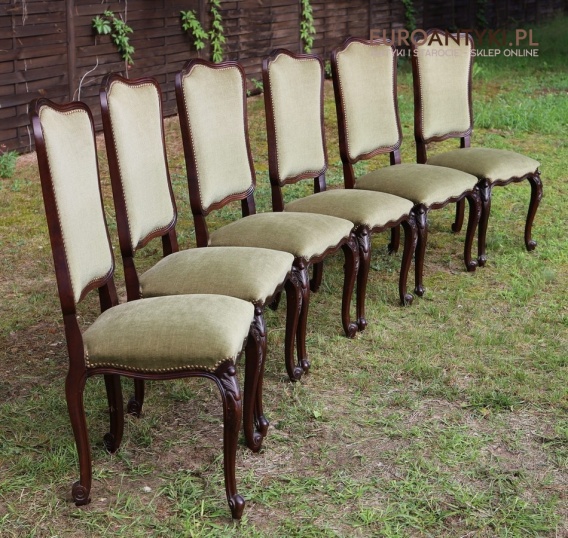 Antyczne krzesła ludwikowskie z litego drewna i tapicerką w kolorze oliwkowej zieleni