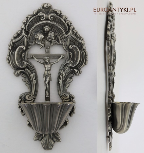 Piękne antyczne naczynie na wodę święconą pochodzi prawdopodobnie z połowy XX wieku, wykonane w stylu barokowym – charakterystycznym dla epoki przepychu, bogactwa detalu i symboliki religijnej. Styl barokowy w dewocjonaliach wyróżnia się dynamicznymi liniami, ornamentami, aniołkami i motywami roślinnymi, które miały podkreślać boski majestat i wzniosłość wiary.