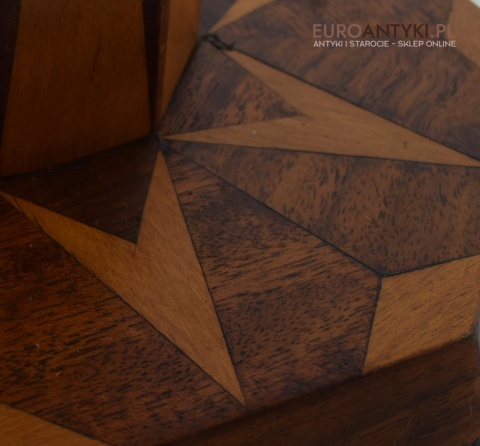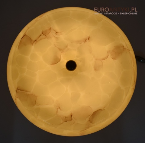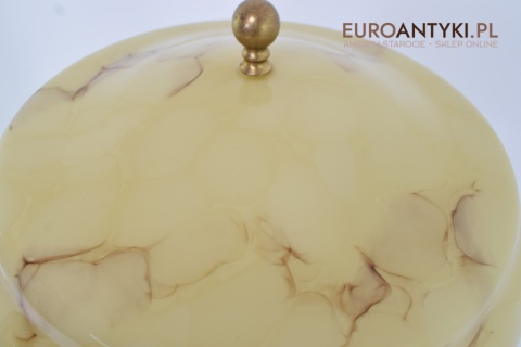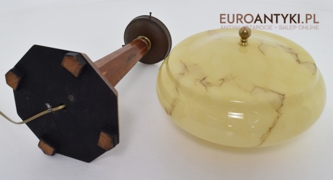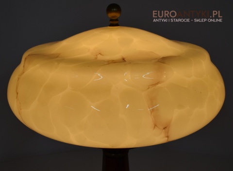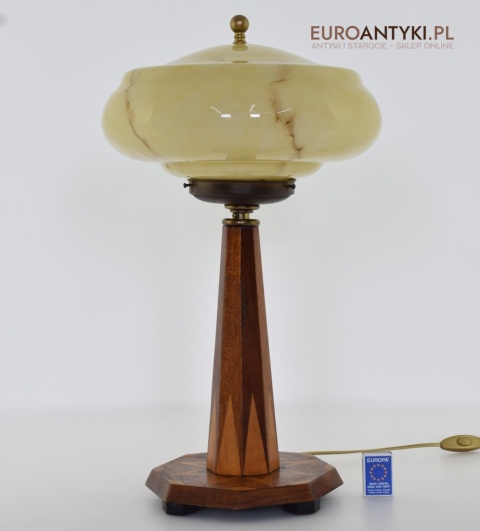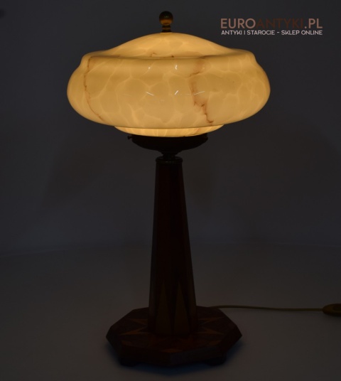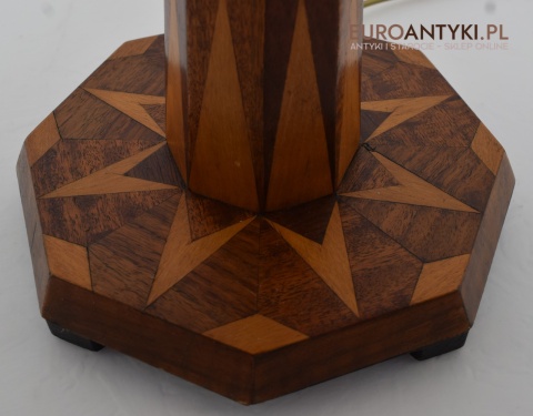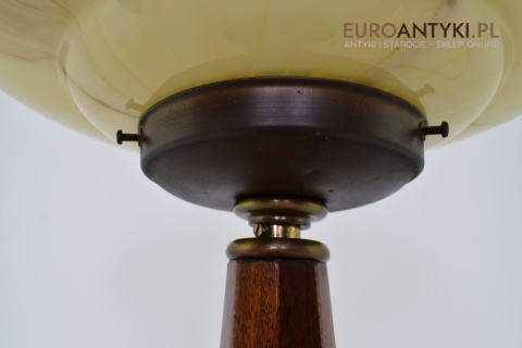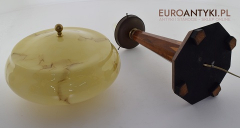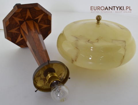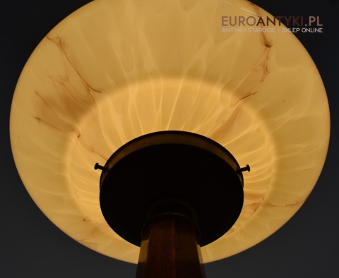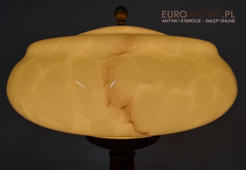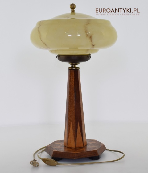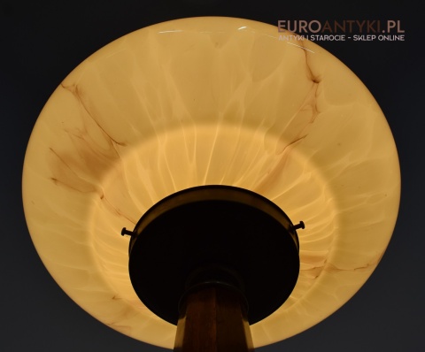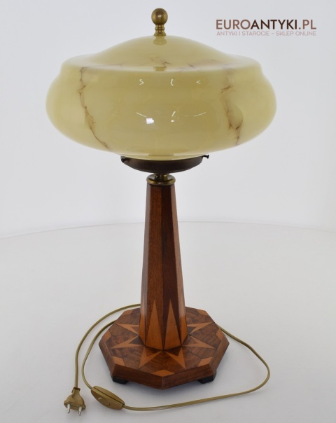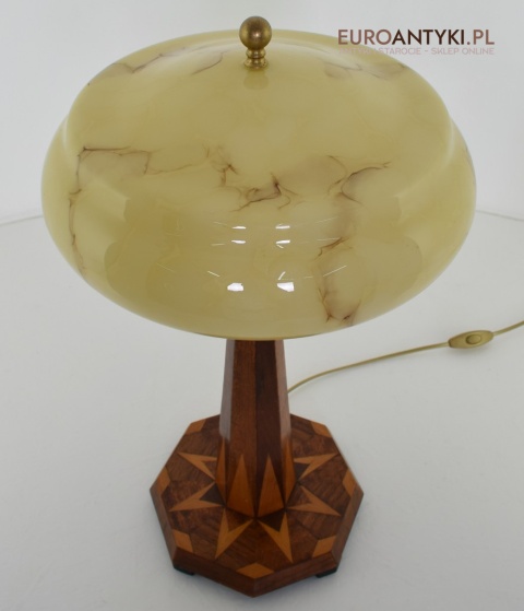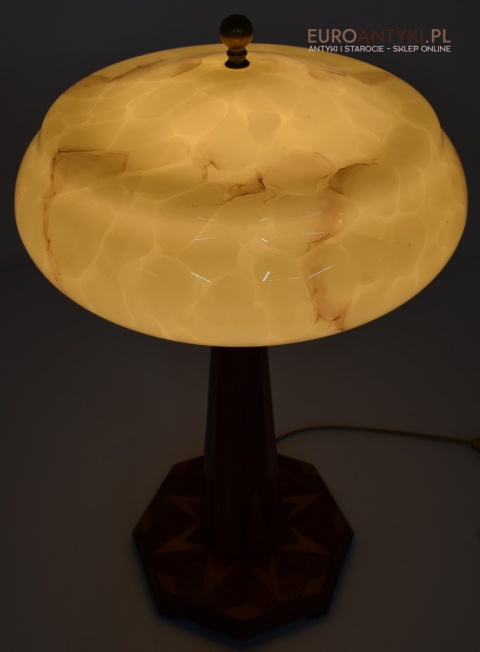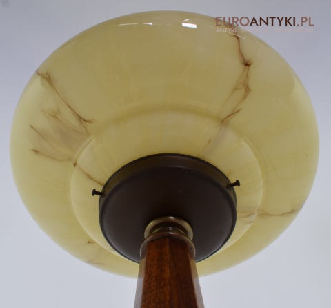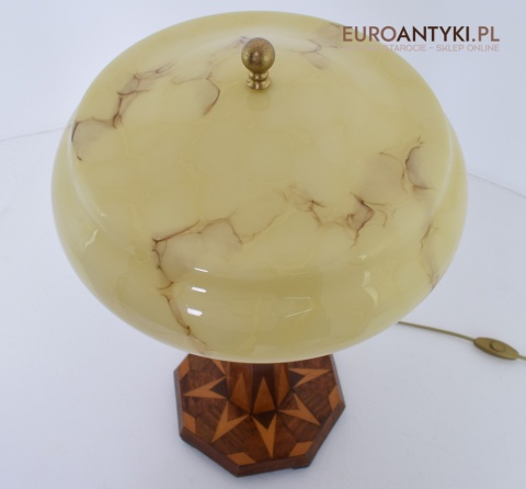 Sprowadzona z Francji. Noga wykonana z litego drewna z intarsjami. Klosz szklany marmurkowy z mosiężną ozdobą na górze - w idealnym stanie.