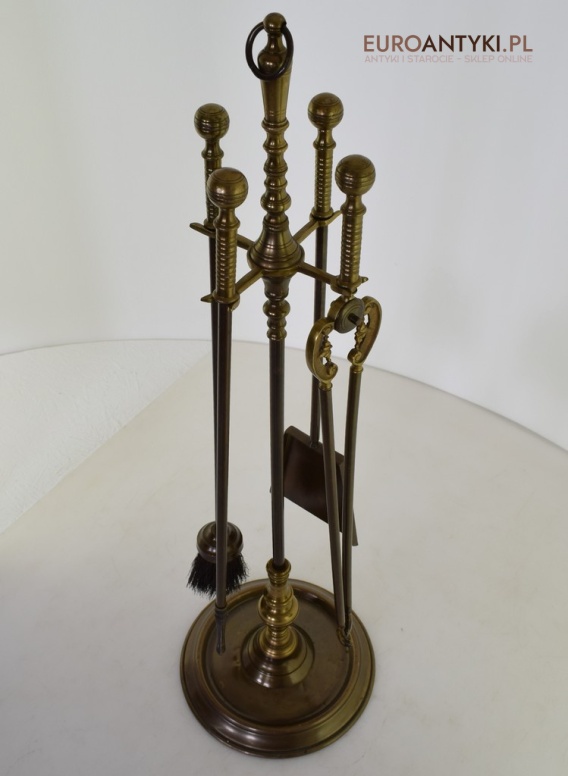 Oryginalny, duży zestaw kominkowy z Austrii z pierwszej połowy XX wieku. W skład kompletu wchodzą: szczotka, pogrzebacz, szczypce, łopatka oraz stylowy stojak. Dzięki dużej i ciężkiej podstawie całość jest bardzo stabilna i nie przewraca się – nawet przy intensywnym użytkowaniu. Idealny do eleganckich wnętrz z kominkiem – od klasyki po styl vintage.