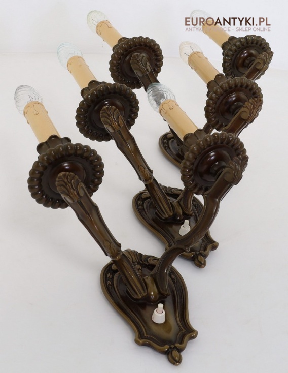 Przedstawiamy masywne kinkiety ścienne, które zachwycają swoją imponującą formą i klasycznym stylem. Wykonane z solidnego brązu, te barokowe kinkiety doskonale wpisują się w estetykę stylu Barok/Rokoko, łącząc bogate zdobienia z funkcjonalnością. Pochodzą z połowy XX wieku i są idealnym przykładem kunsztu artystycznego tamtego okresu. Sprowadzone z Francji. Każdy kinkiet w rozecie ma sprawny włącznik/wyłącznik dopływu prądu do żarówek.