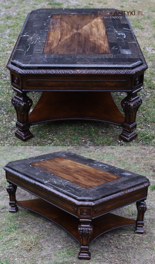 Kawowy stolik pałacowy vintage z epoki – masywny marmur + drewno, stylowe wykonanie