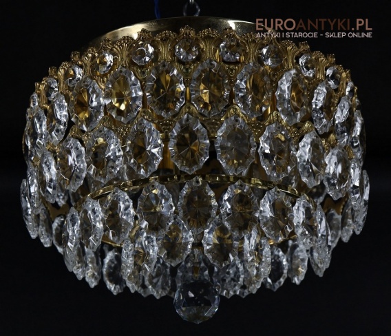 Przedstawiamy mały plafon kryształowy z efektowną kaskadą zawieszek oraz dekoracyjną kryształową kulą u dołu. Ten oryginalny egzemplarz pochodzi z Francji, z około 1970 roku, i łączy w sobie klasyczną elegancję z nutą stylu glamour. Kunsztowne detale w złoconym mosiądzu oraz fasetowane kryształy tworzą niezwykłe efekty świetlne, zwłaszcza w promieniach słońca – czego zdjęcia nie oddają, ale na żywo robi to ogromne wrażenie! 🌞💎