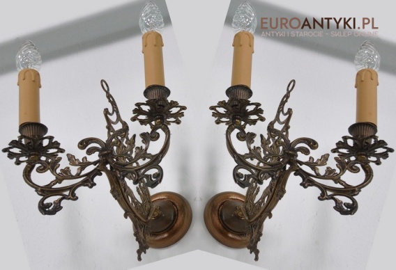 Stare DUZE kinkiety wykonane z brazu/mosiadzu + debowa rozetka przylegajaca do sciany . Z tylu rozetki jest specjalne miejsce na montaz na scienie . Kompletne . Elektryka sprawna - sprawdzana . Stan bardzo dobry . Lampki kupione na gieldzie antykow w Austrii .