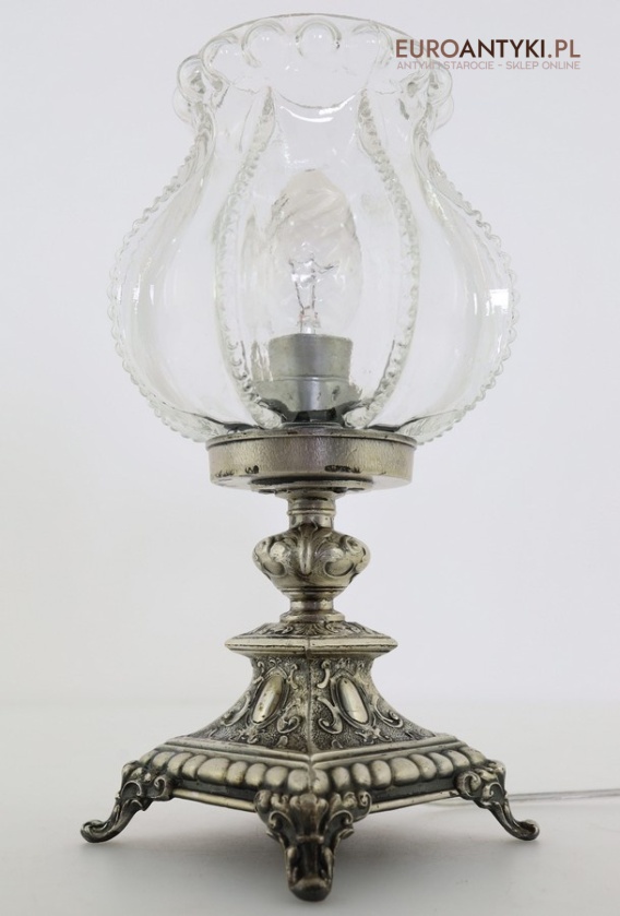 Stylowa lampka stołowa retro sprowadzona z Francji. Wykonana z odlewu metalowego galwanizowanego w kolorze „stare srebro” oraz z wyjątkowo efektownego szklanego klosza. Po zapaleniu żarówki klosz pięknie rozprasza światło i rzuca dekoracyjne wzory na ściany — dokładnie taki „ciepły”, przytulny klimat vintage, którego nie daje współczesna masówka.
