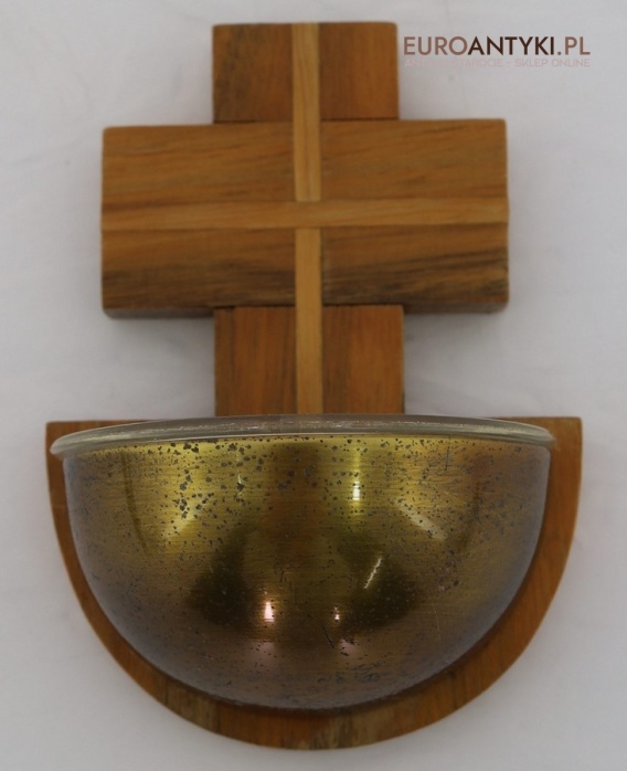 Ten egzemplarz pochodzi z połowy XX wieku i stanowi wyjątkowy przykład klasycznego sakralnego rękodzieła. Wykonany został z litego drewna z pięknym usłojeniem oraz mosiężnej czarki, której powierzchnia pokryta jest naturalną patyną czasu – prawdziwy dowód autentyczności. Wnętrze naczynia stanowi szczelna miseczka z tworzywa sztucznego, co czyni przedmiot w pełni funkcjonalnym i gotowym do użytku.