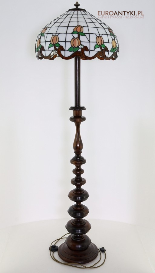Przedstawiamy starodawną i niepowtarzalną lampę podłogową w stylu TIFFANY, z witrażowym kloszem ręcznie wykonanym metodą tradycyjną. Klosz zdobiony motywem stylizowanych tulipanów został wykonany z prawdziwego szkła witrażowego TIFFANY, co nadaje mu wyjątkowy, ponadczasowy charakter. Piękna, toczona ręcznie drewniana podstawa w stylu vintage znakomicie współgra z artystycznym kloszem, tworząc arcydzieło sztuki użytkowej. Lampa sprowadzona z Francji - lata 60./70. XX wieku.