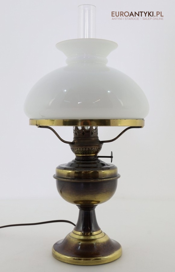 Wykonana z masywnego mosiądzu oraz solidnego szkła: mlecznobiały (opalowy) klosz + szklany komin. Lampa ma naturalne oznaki wieku: patyna, nalot i szlachetne ślady użytkowania na mosiądzu, co tylko dodaje autentycznego klimatu retro/vintage. Brak uszkodzeń mechanicznych.