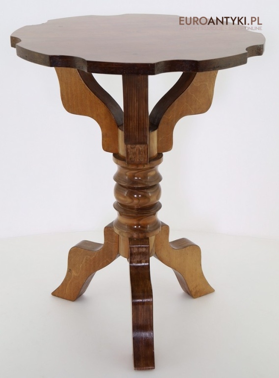 Powstał prawdopodobnie w drugiej połowie XX wieku i zachował się w bardzo dobrym stanie – bez uszkodzeń, pęknięć czy śladów korników. Solidna konstrukcja sprawia, że można na nim postawić ciężką lampę, rzeźbę czy kwietnik. Dzięki nietypowemu kształtowi nóg i finezyjnie wykończonemu blatowi, stolik pełni zarówno funkcję użytkową, jak i dekoracyjną.