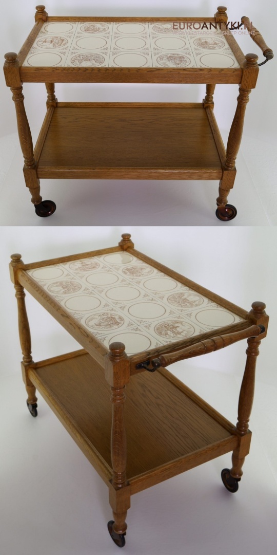 Oferujemy stary barek na kółkach, sprowadzony z Francji, wykonany z litego dębu, z pięknie zdobionym blatem z ceramicznych kafli w stylu rustykalnym. Rączka wykonana z kutego metalu oraz drewna – solidna i wygodna w prowadzeniu. Perfekcyjny stan techniczny i wizualny – nie rozklekotany, stabilny, czysty, bez śladów po drewnojadach czy nieprzyjemnych zapachów. Gotowy do użytku i prezentacji! 🌟