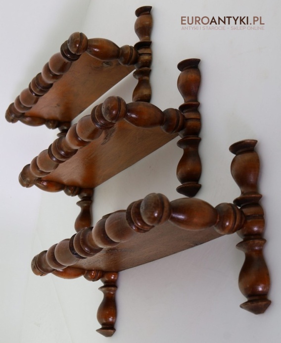 Półki są w pełni sprawne, kompletne, gotowe do zawieszenia. Drewno i sklejka w stanie bardzo dobrym, bez oznak po kornikach i bez nieprzyjemnych zapachów zawilgocenia lub dymu papierosowego. Widoczne jedynie naturalne ślady użytkowania wynikające z wieku.
