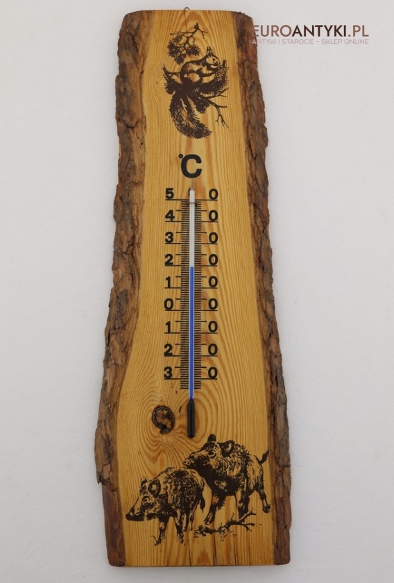 Unikatowy termometr myśliwski retro, sprowadzony z Francji, pochodzi z lat 70.–80. XX wieku. Wykonany został z prawdziwej deski sosnowej z zachowaną naturalną korą po bokach, co podkreśla jego rustykalny i leśny charakter. Na powierzchni widnieją zdobienia – wiewiórka na gałęzi sosny oraz dwa dziki – wykonane w technice nadruku. Termometr jest w pełni sprawny i wskazuje temperaturę prawidłowo, co potwierdzono porównaniem z innymi urządzeniami. Deska została polakierowana, dzięki czemu jest zabezpieczona i trwała.