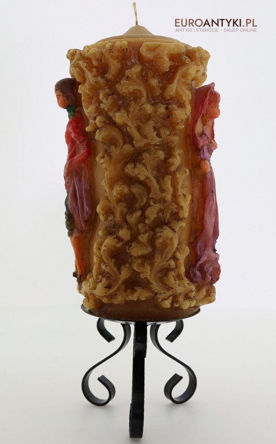 Ta antyczna świeca w stylu rokokowym to dzieło dekoracyjne, które przyciąga wzrok. Rokoko to styl pełen lekkości, elegancji i dekoracyjnych ornamentów – właśnie takich jak widoczne na tej świecy bogate fale wosku, które otaczają postacie jak ramy rzeźbionego reliefu.