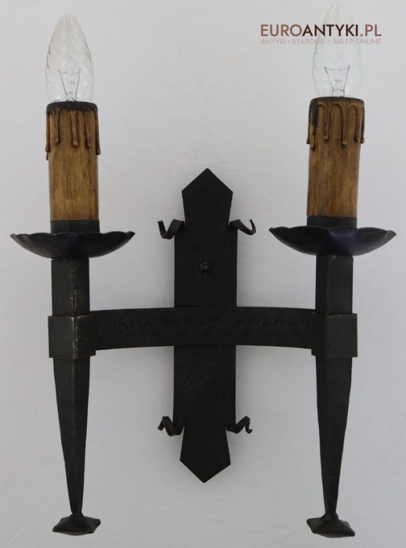 Masywny kinkiet w stylu rycerskim / zamkowym, pochodzący z przełomu lat 60. i 70. XX wieku.