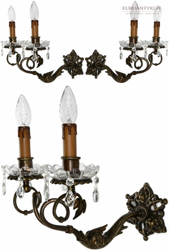 Lata 20/30 XX wieku – prezentujemy duże antyczne kinkiety w klimacie vintage, sprowadzone z Francji. To ciężkie, solidne, dekoracyjne kinkiety z epoki, wykonane z masywnych odlewów z brązu, z pięknie odlanymi detalami. Każdy punkt świetlny ma kryształowy talerzyk pod gilzą oraz cztery kryształowe zawieszki, które efektownie mienią się w słońcu i w świetle żarówki. Forma jest wyraźnie pałacowa i historyzująca – dominują roślinne ornamenty, wykręcane linie oraz motyw „morskiej” główki/ryby widoczny na ramieniu (bardzo charakterystyczny detal). Styl całości określiłbym jako neobarokowy / neorokokowy (z lekką nutą płynnych linii jak w secesji) – typowa, bogata dekoracja z początku XX wieku. Kinkiety zostały lekko odrestaurowane: założyliśmy nowe, wykonane przez naszą firmę gilzy. Stan całości idealny, a z tyłu znajduje się bardzo solidna zawieszka/mocowanie montażowe. Całość robi wrażenie “jubilerskiej” roboty.