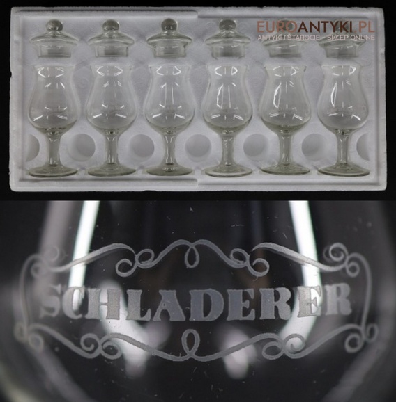 Wszystkie kieliszki i pokrywki wykonane są z przezroczystego szkła wysokiej jakości. To tworzywo dziś rzadko stosowane w produkcji masowej – szklana grubość i klarowność nadają wyrobom solidność i elegancki ciężar. Ręczne grawerowanie nazwy Schladerer podnosi prestiż i sprawia, że zestaw zyskał walor kolekcjonerski.