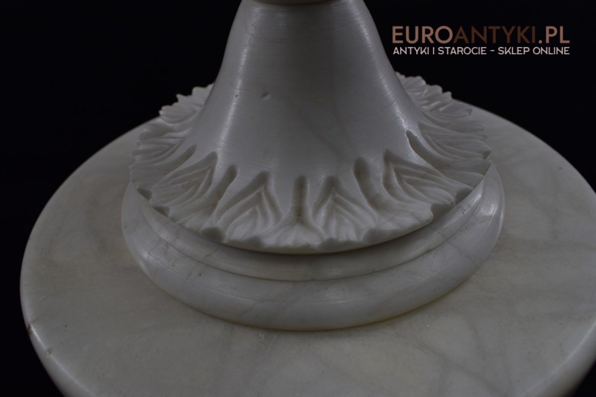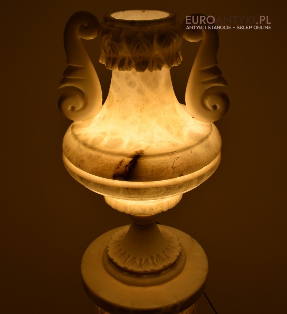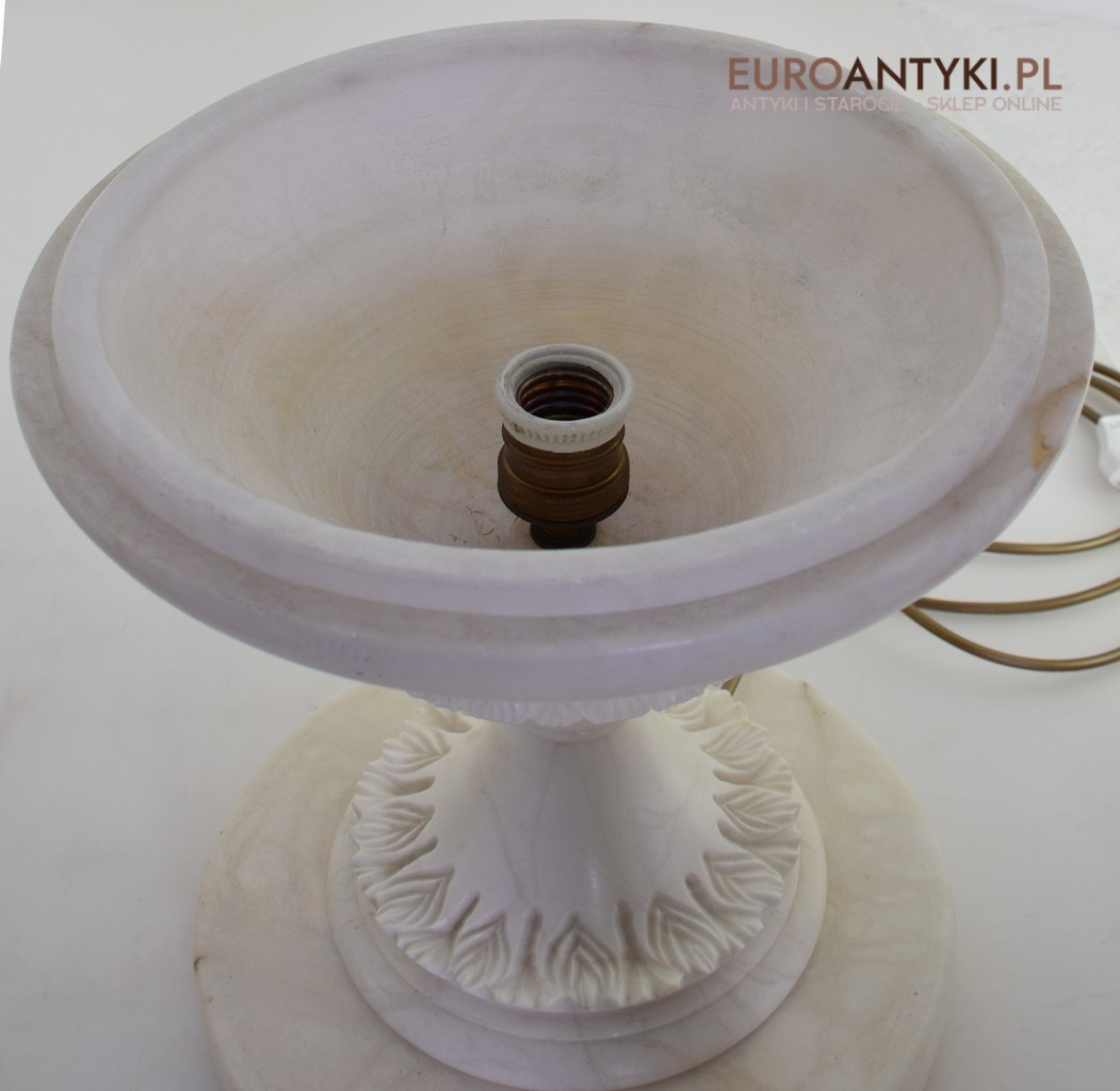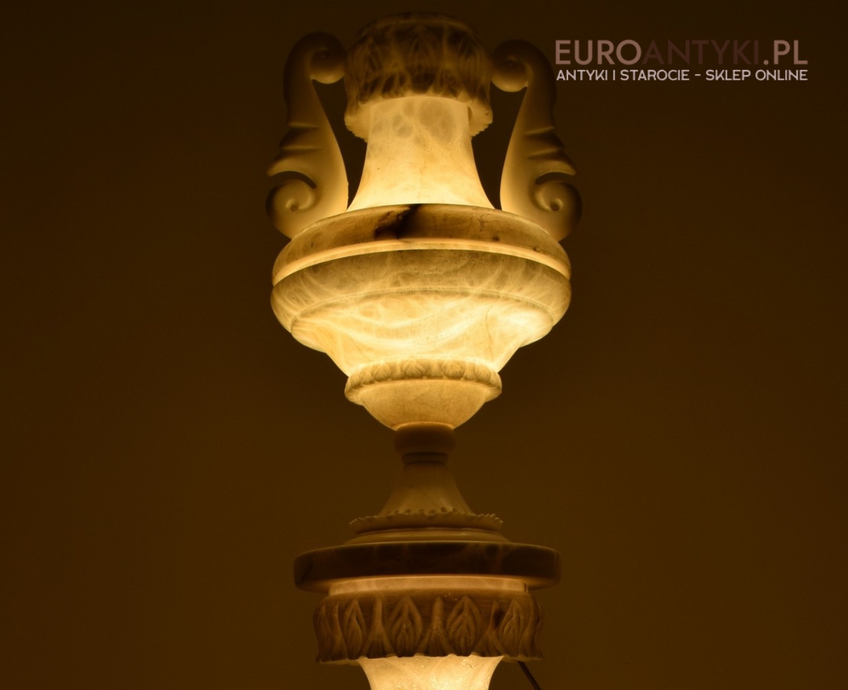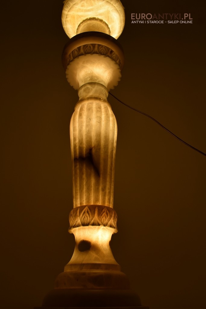 Lampa została wykonana z masywnego, naturalnego alabastru, materiału cenionego od wieków za swoją delikatną strukturę i zdolność do subtelnego przepuszczania światła. Dziś alabaster to rzadkość w produkcji z powodu wysokich kosztów i trudności w obróbce, dlatego ten egzemplarz jest wyjątkową perełką na rynku antyków.