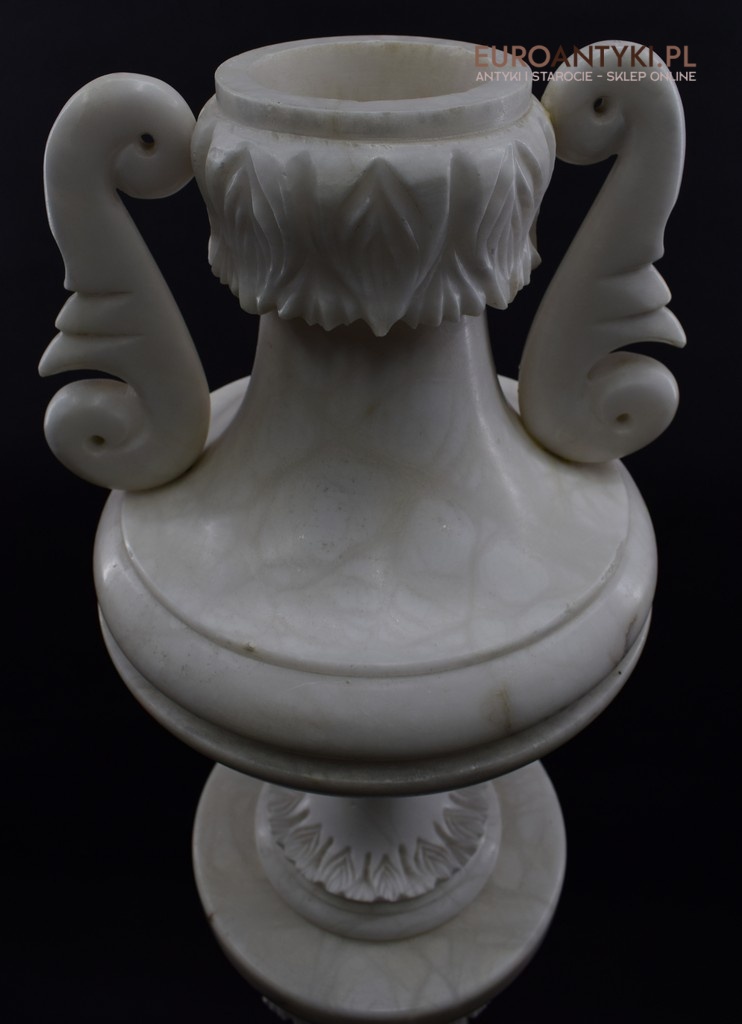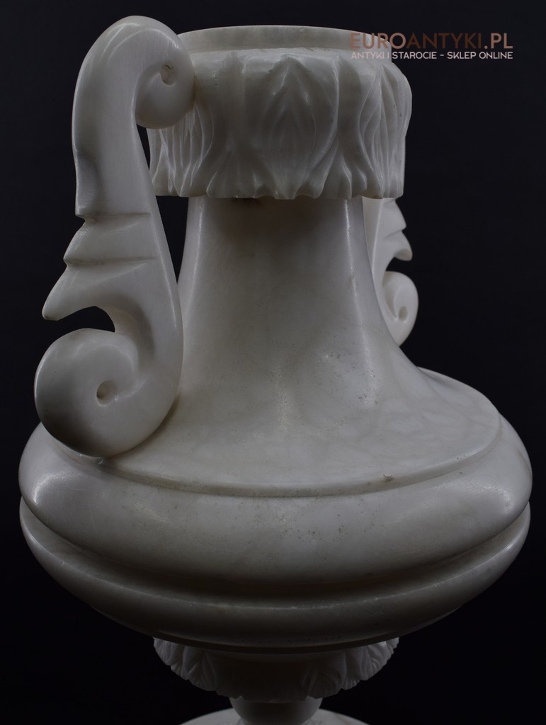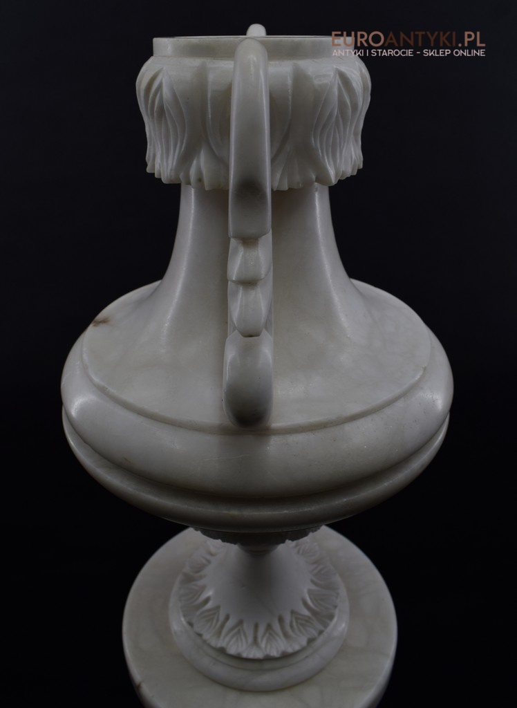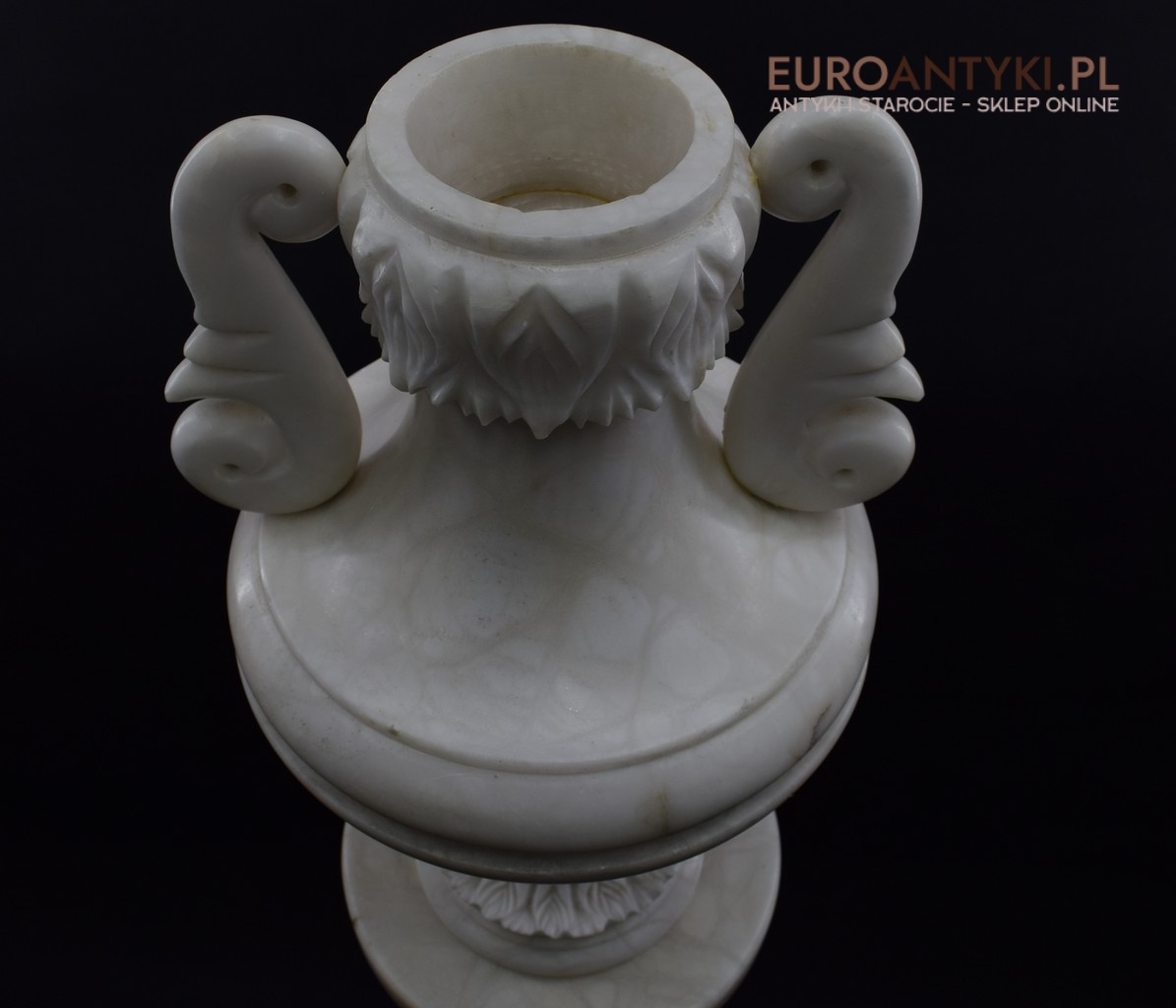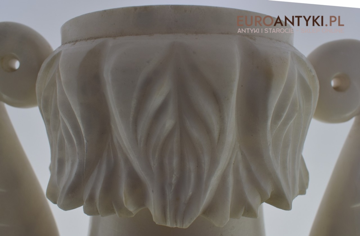 Lampa została wykonana z masywnego, naturalnego alabastru, materiału cenionego od wieków za swoją delikatną strukturę i zdolność do subtelnego przepuszczania światła. Dziś alabaster to rzadkość w produkcji z powodu wysokich kosztów i trudności w obróbce, dlatego ten egzemplarz jest wyjątkową perełką na rynku antyków.