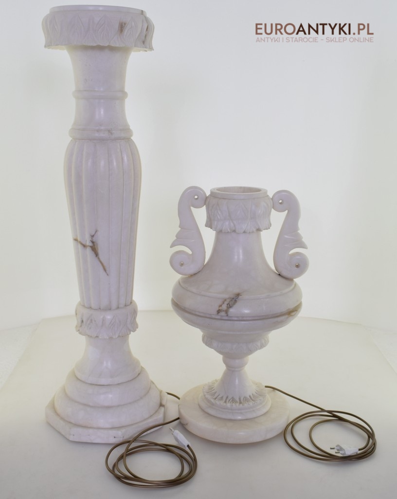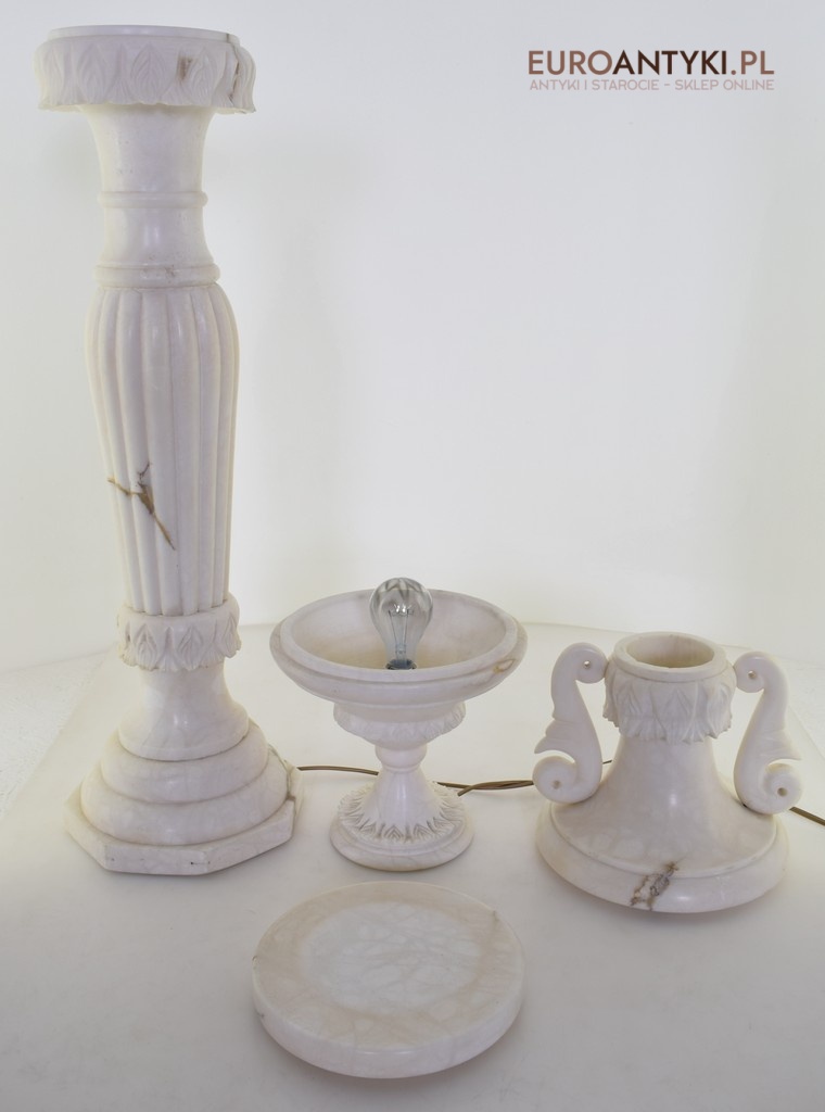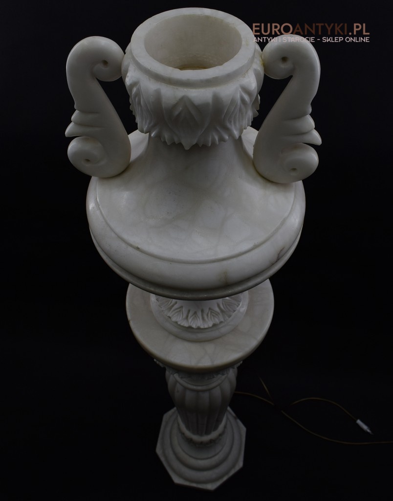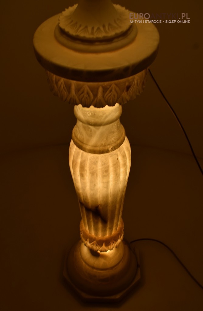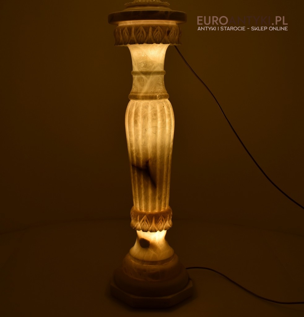 Wymieniliśmy wszystkie przewody na nowe ( w stylu vintage ), dbając o bezpieczeństwo i zachowanie klimatu epoki. Wnętrze kolumny skrywa 3 gniazda na żarówki E14, a górna część lampy jest przystosowana do żarówki E27, co daje spektakularny efekt podświetlenia alabastru – jak widać na zdjęciach.
