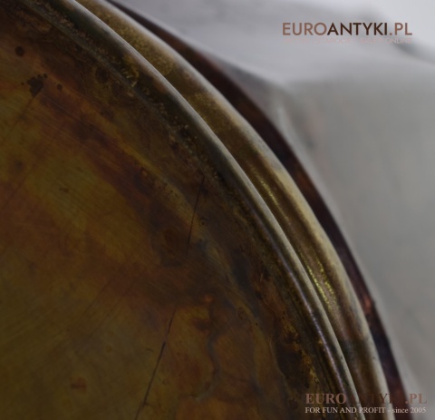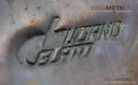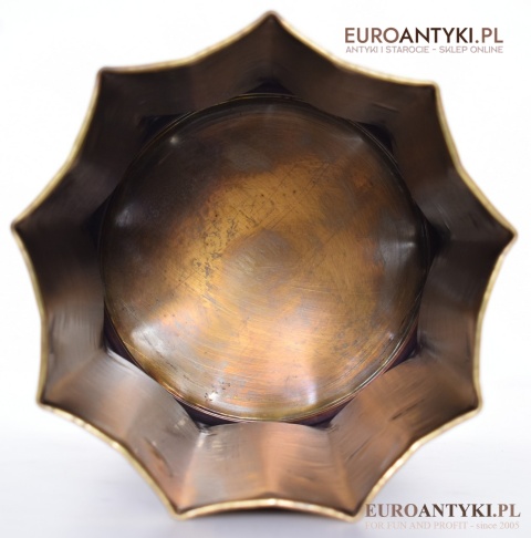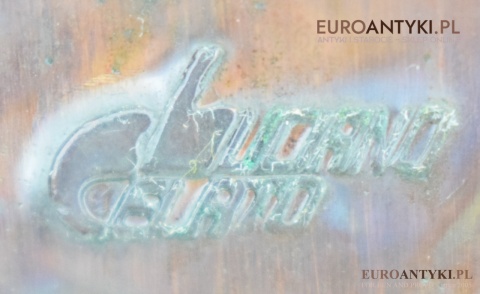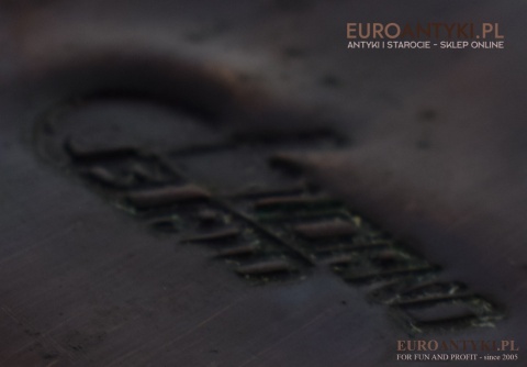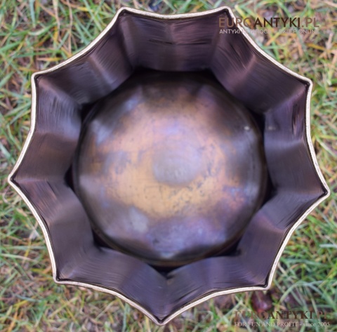 Bardzo ciekawy i nietypowy design. Wykonany z wyjątkowo grubej blachy mosiężnej. Bez żadnych uszkodzeń mechanicznych typu wgniecenia, popękania - na zdjęciach w studiu wydaję się że jest w niektórych miejscach pognieciony - ale to odbłysk od lamp fotograficznych - POJEMNIK JEST W IDEALNYM STANIE. Sygnowanie na boku widoczne na zdjęciach.