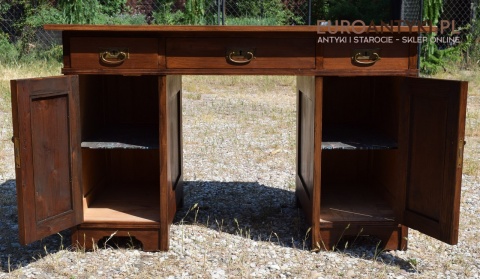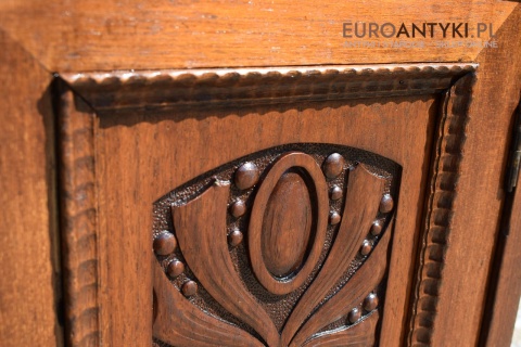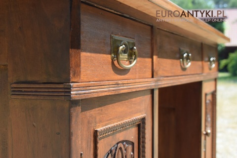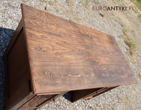 Przedstawiamy wyjątkowe antyczne biurko wykonane z dębu, pochodzące z przełomu XIX i XX wieku. To mebel, który przyciąga uwagę swoimi bogato zdobionymi frontami, charakterystycznymi dla stylu Secesji. Biurko zostało profesjonalnie odnowione, w tym ręcznie wyszlifowane i pokryte olejem do drewna na bazie wosku pszczelego, co podkreśla jego naturalne piękno i zapewnia długotrwałą ochronę.