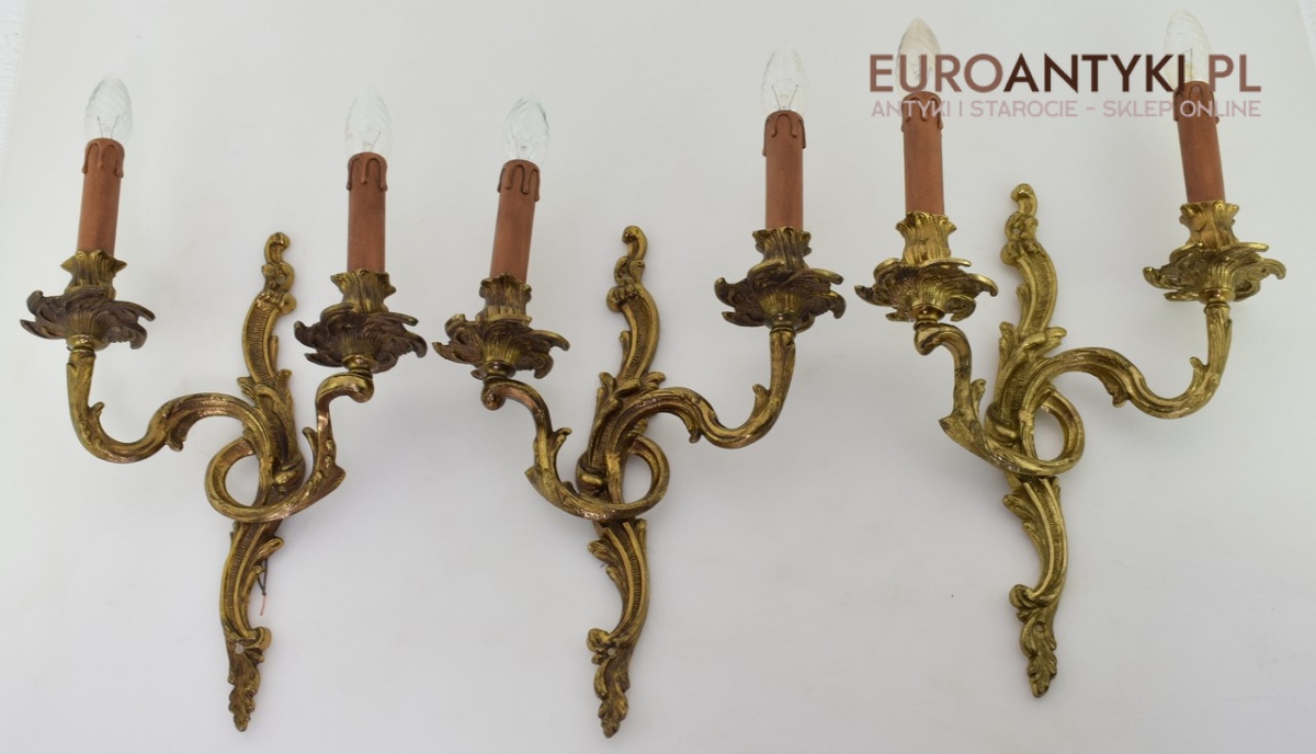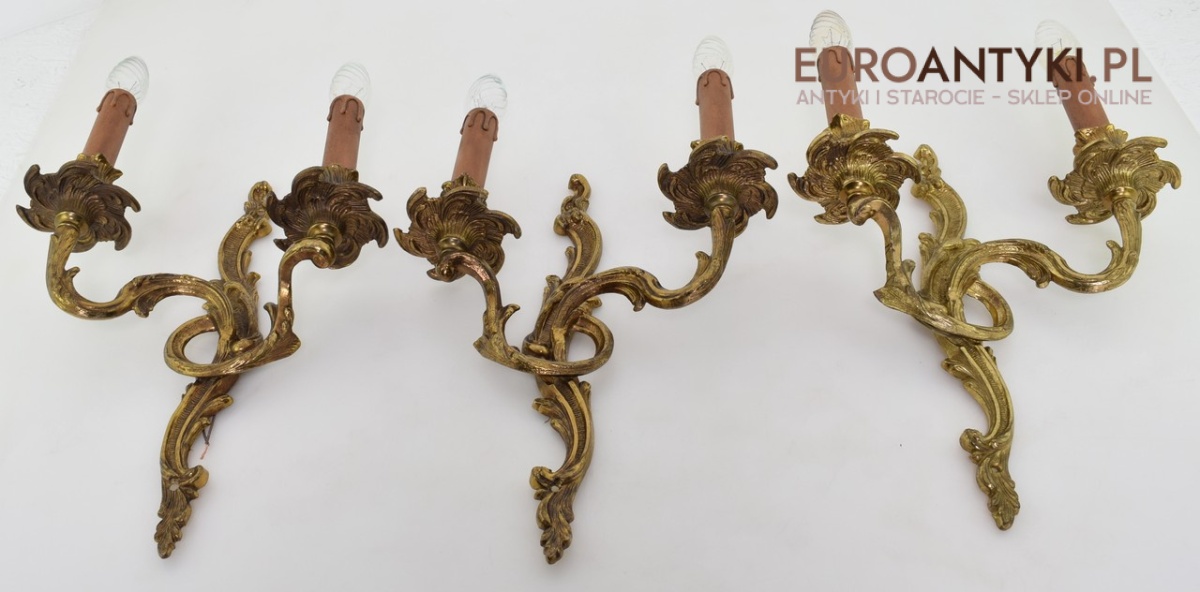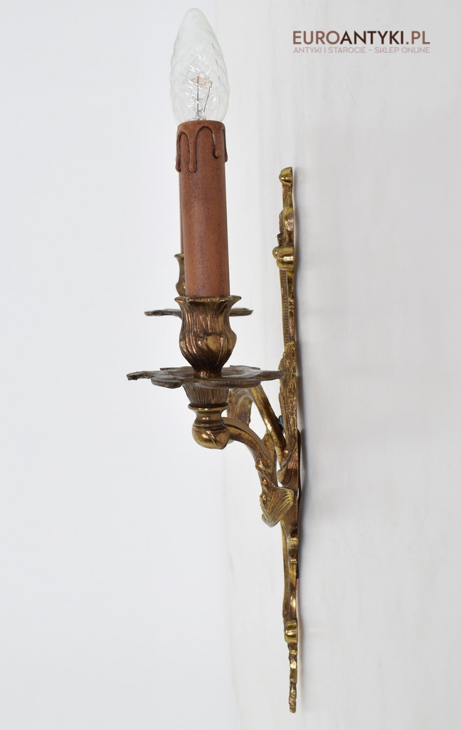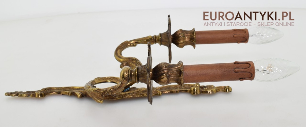 Stare kinkiety wykonane z pięknych odlewów mosiężnych. Z tyłu są specjalne miejsca do montażu ściennego.