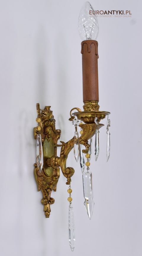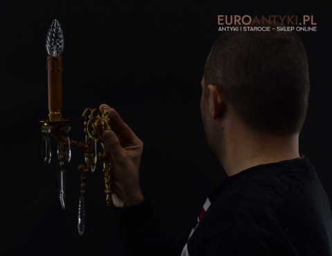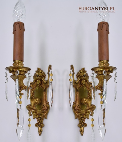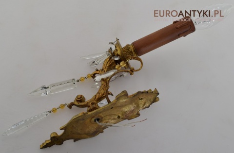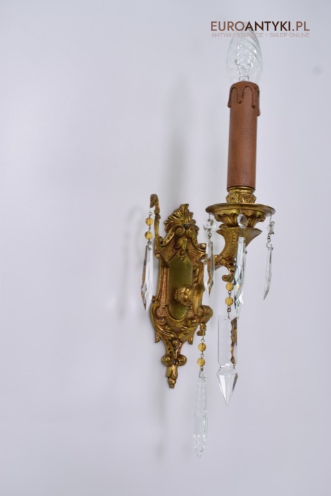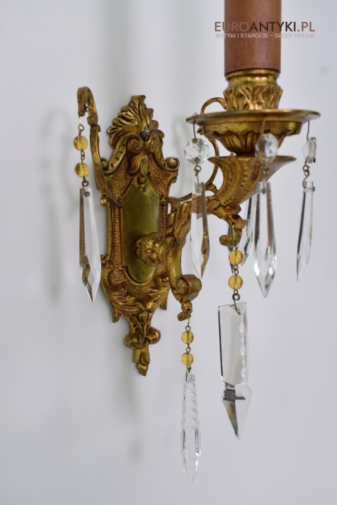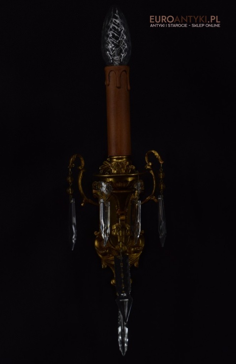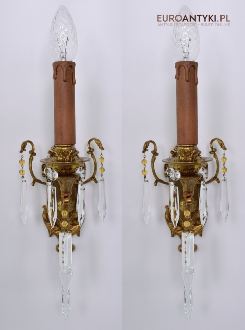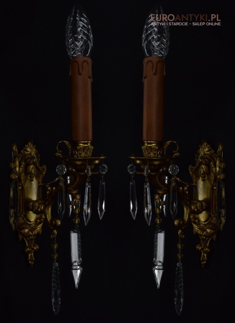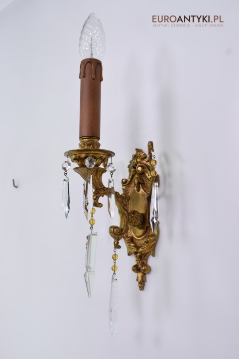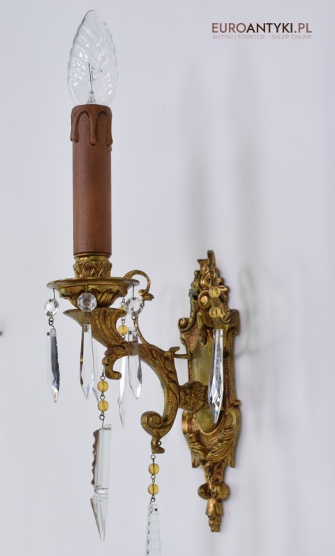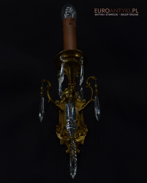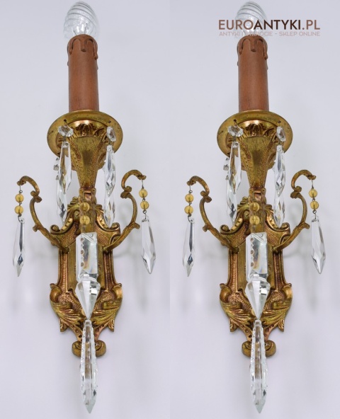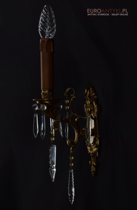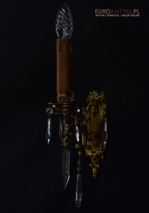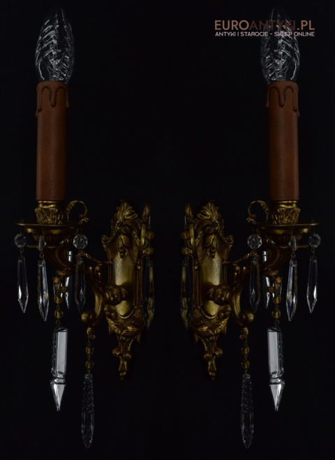 Prawdziwe antyczne kinkiety, sprowadzone z Austrii. Wykonane z odlewów mosiężnych + prawdziwe kryształowe zawieszki w stylu Swarovski. Kryształy są wyjątkowo piękne i ślicznie mienią się gdy pada na nie światło, szkoda że zdjęcia nie ukazują tego pokazu iluminacji, bo naprawdę jest na co popatrzeć. Kryształy kompletne i w bardzo dobrym stanie. Nie poobijanie, nie klejone, nie pokruszone. 100% kompletne.