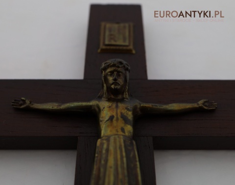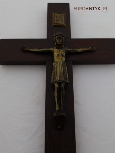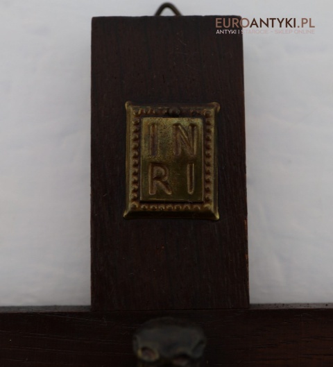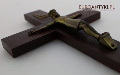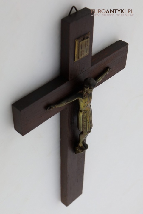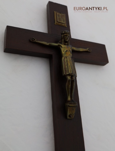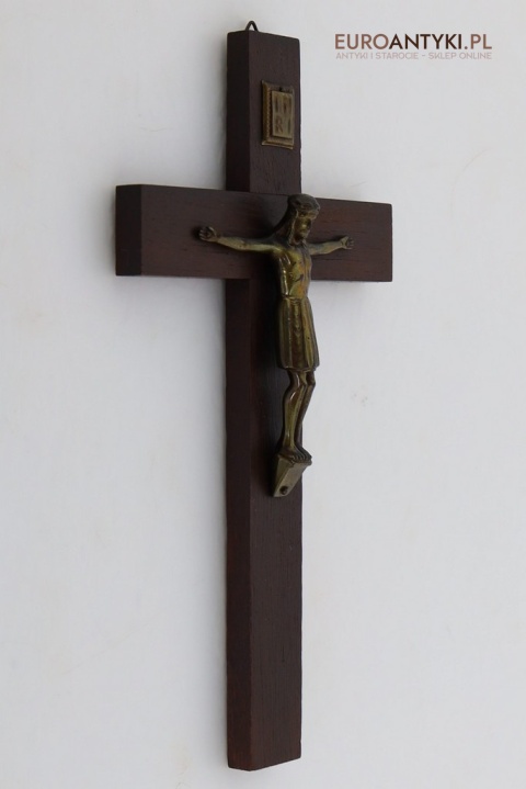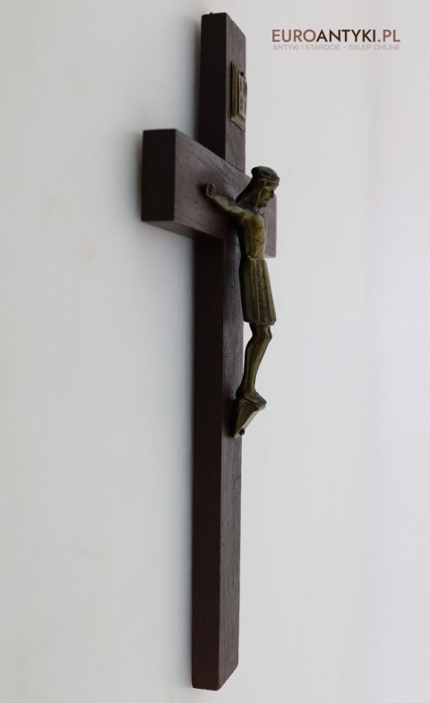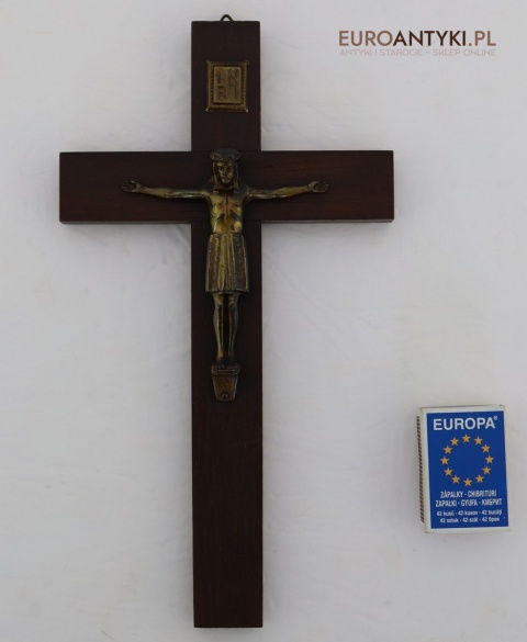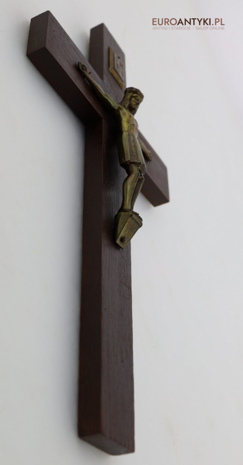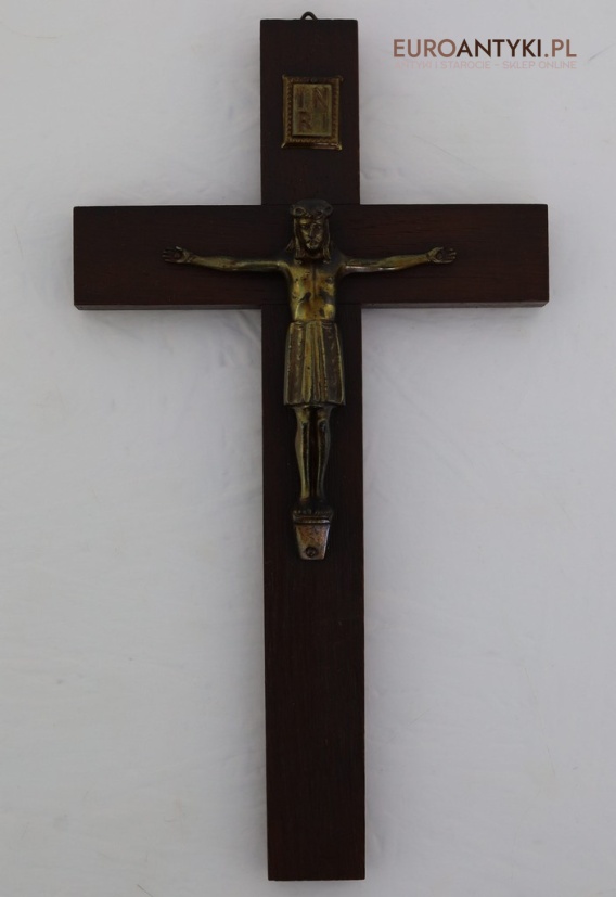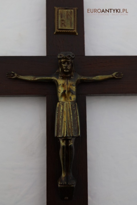 Przedstawiamy stary, niemiecki antyczny krucyfiks, sprowadzony z Francji, który stanowi wyjątkowy przykład sakralnej sztuki użytkowej. Ten vintage krucyfiks wykonany jest z ciemnego, solidnego drewna, na którym umieszczono metalową figurkę Chrystusa o subtelnych detalach. Ten wyjątkowy przedmiot pochodzi z połowy XX wieku, a jego styl nawiązuje do klasycznych wzorców religijnych, co nadaje mu niepowtarzalny charakter i historyczną wartość. W górnej części krzyża metalowa tabliczka z napisem INRI.