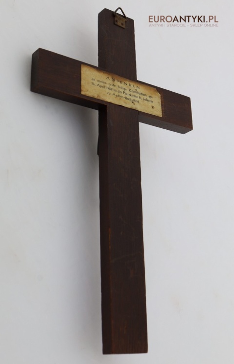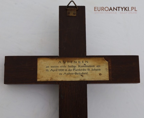 Z tyłu krzyża znajduje się specjalna pamiątkowa kartka z tekstem po niemiecku: