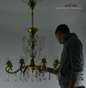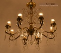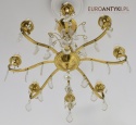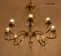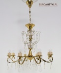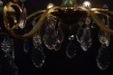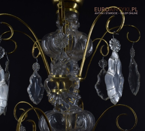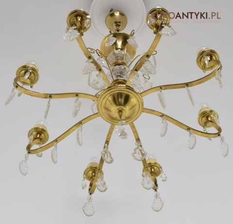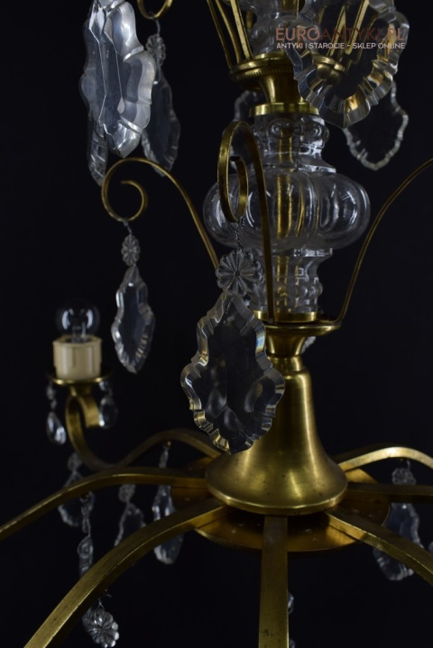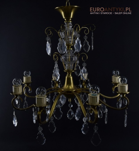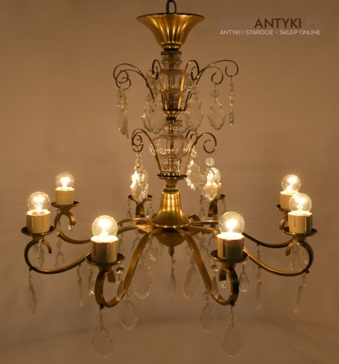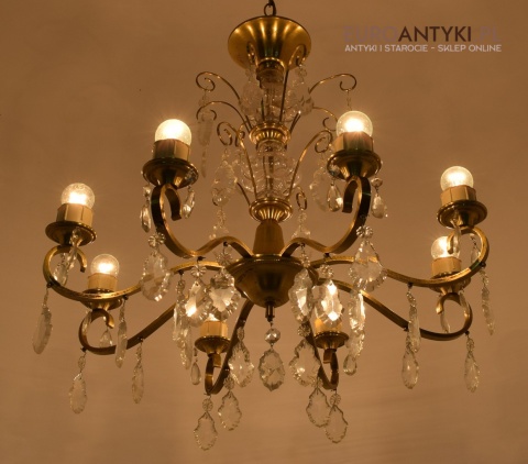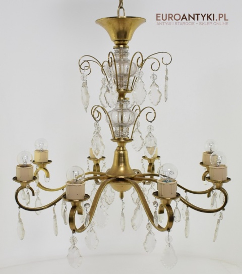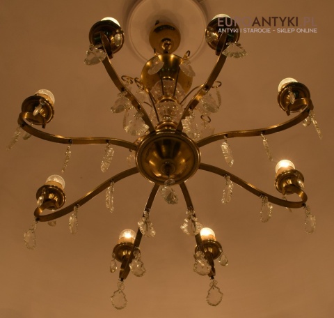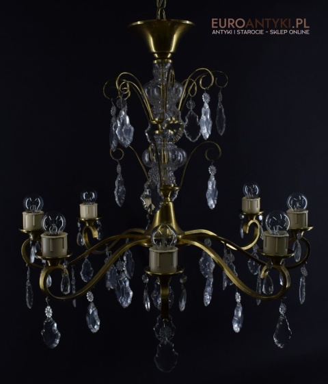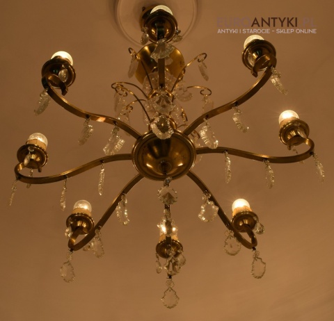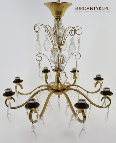 Sprowadzony z Austrii, typowy francuski żyrandol z lat 1930-40. Wykonany z mosiądzu + szklane wisiory i kulki + kryształowe zawieszki i kryształowa kulka pod spodem. Wymieniliśmy gilzy na nowe w stylu retro/vintage.
