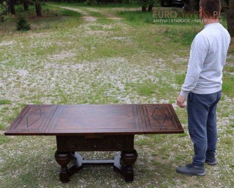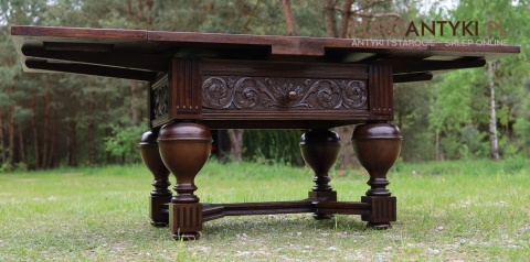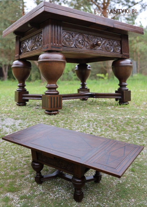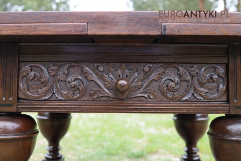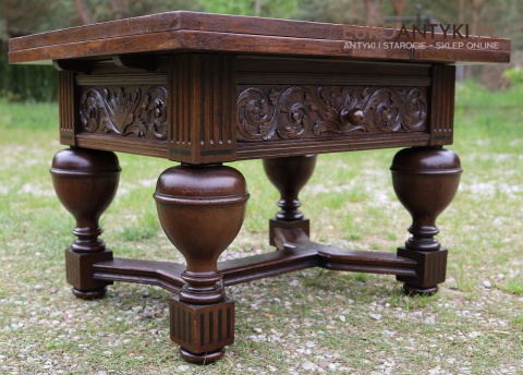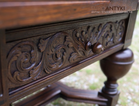 Przedstawiamy unikatowy, ANTYCZNY stolik kawowy w stylu NEORENESANSOWYM, wykonany w całości z litego drewna dębowego, sprowadzony z Francji. To wyjątkowy przykład ręcznej rzeźby i kunsztu stolarskiego z przełomu XIX i XX wieku – około 1890-1910 r.