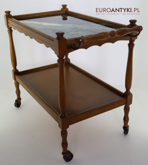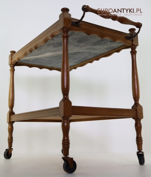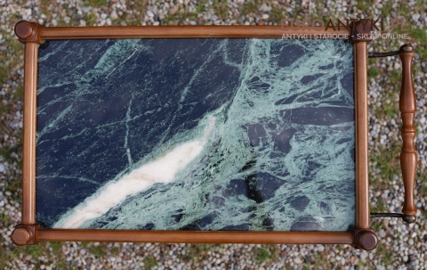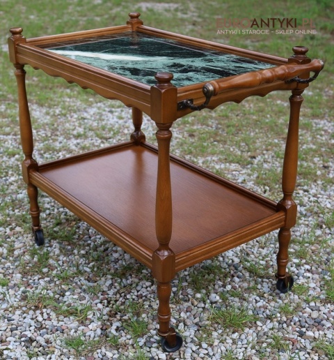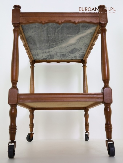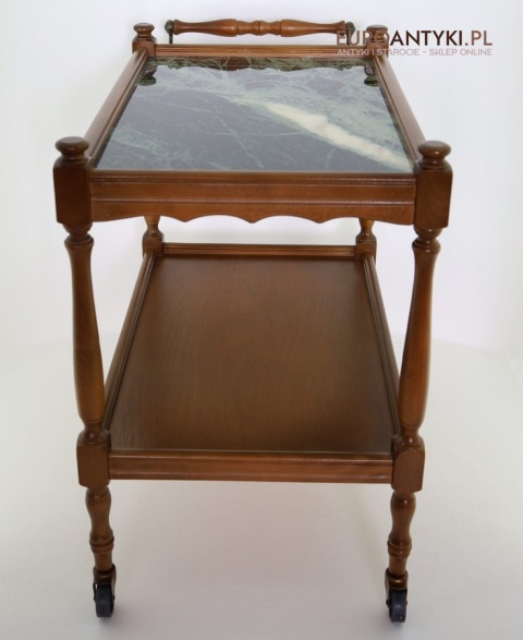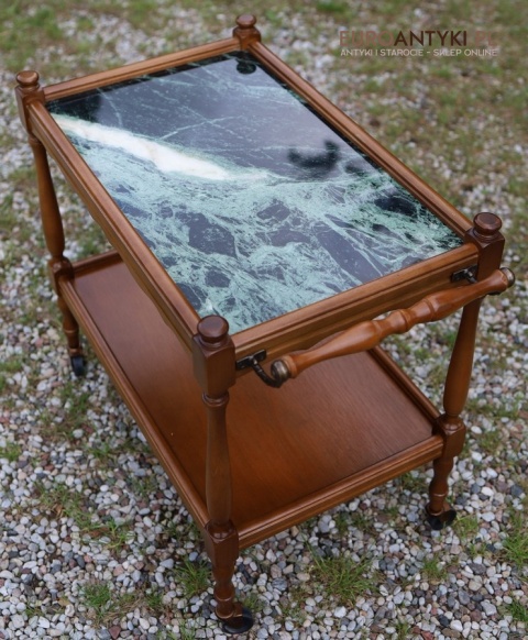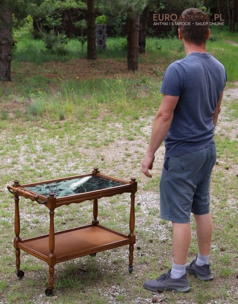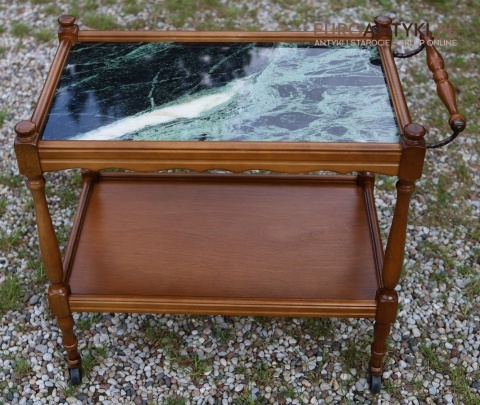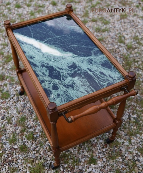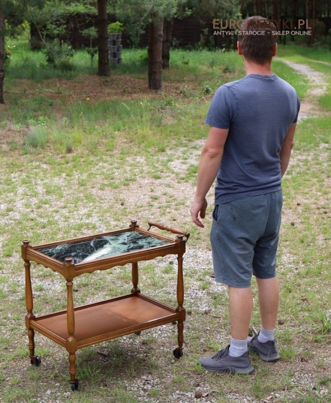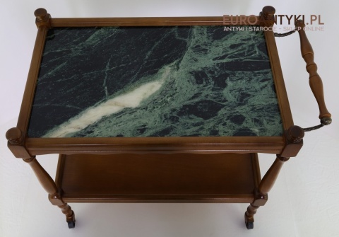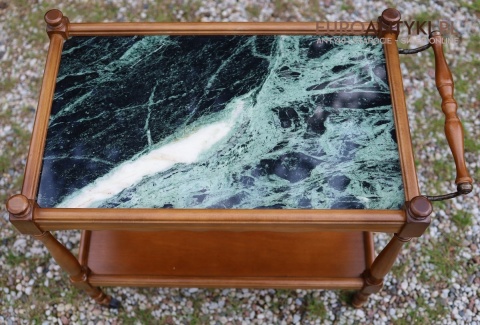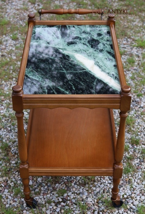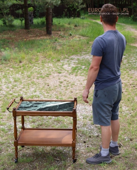 Francuski barek vintage z lat 50-60. – lite drewno i elegancki zielony marmur Verdi Alpi - Antyczny stoliczek na kółkach - SOLIDNIE WYKONANY! 30 kg wagi!