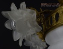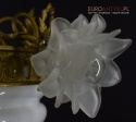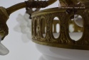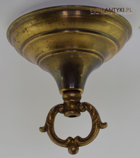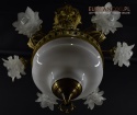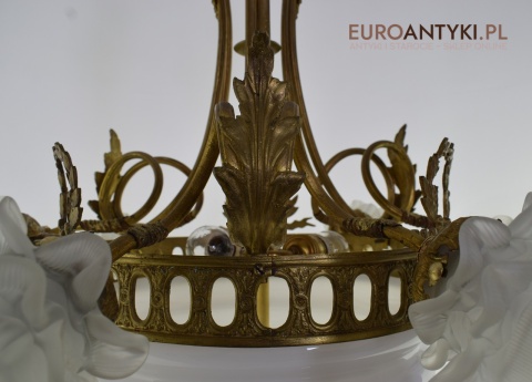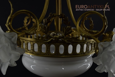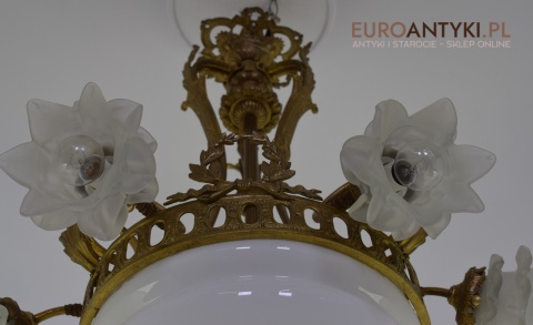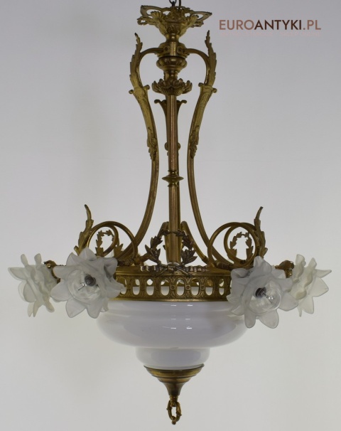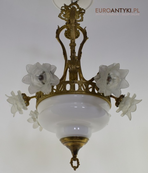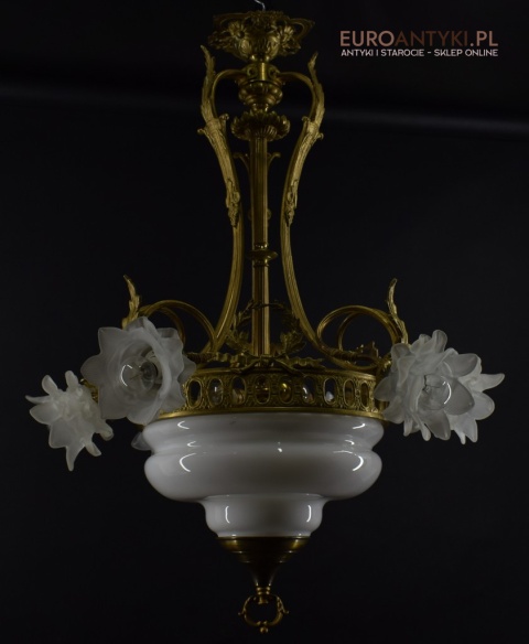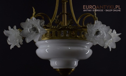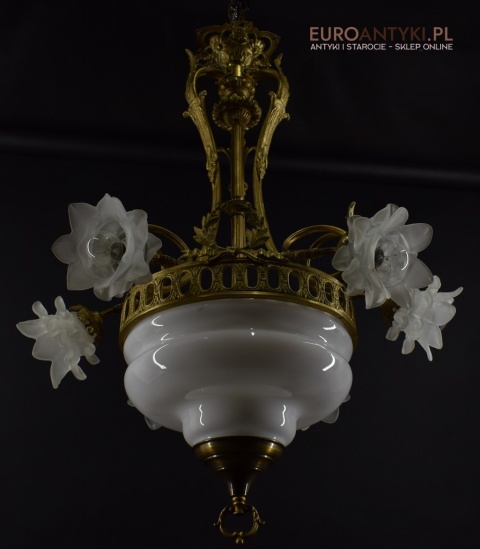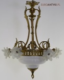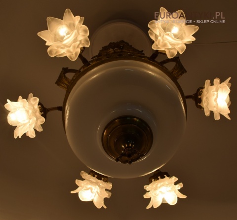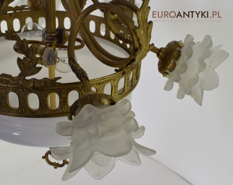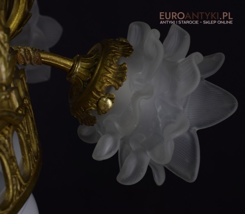 Sprowadzony z Francji. Wykonany z pięknych i masywnych odlewów mosiężnych - waga to 12 kg! Klosze szklane we florystycznej formie + 1 mleczny szklany klosz pod spodem. Klosze w IDEALNYM STANIE, nie klejone, nie łatane, nie wyszczerbione - 100% ok!