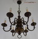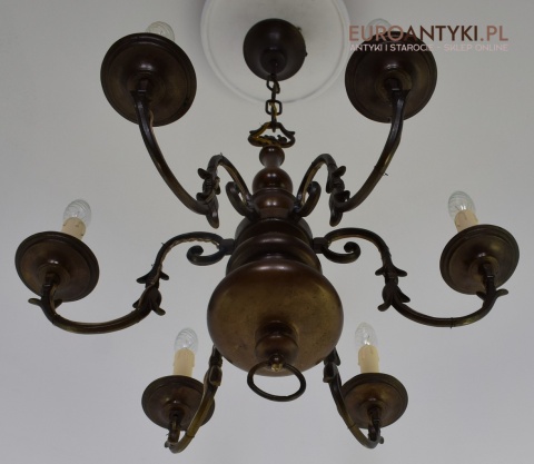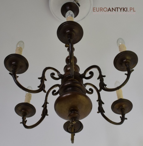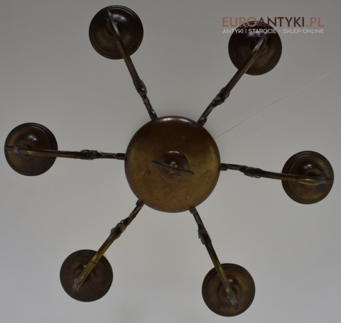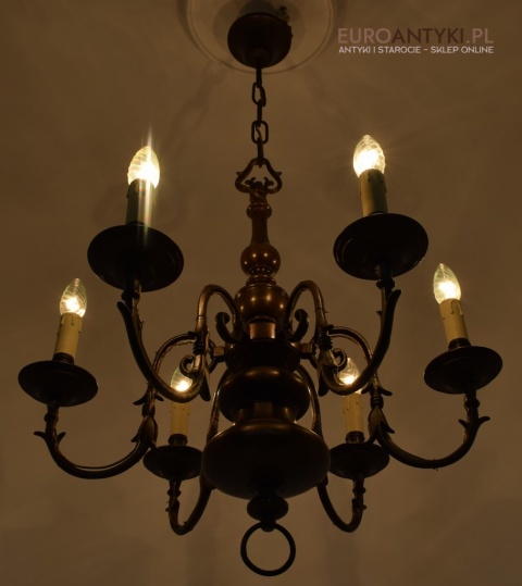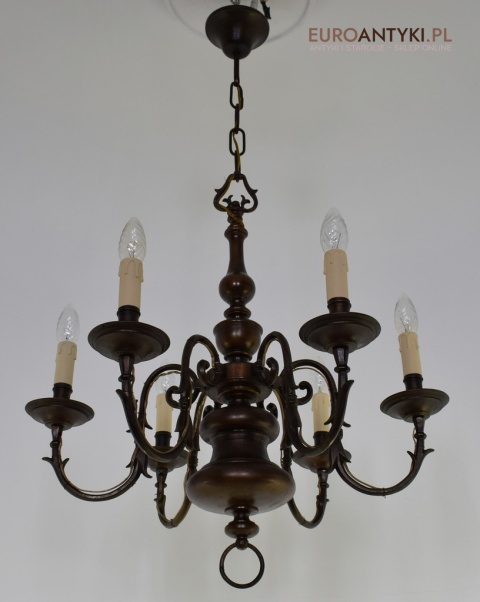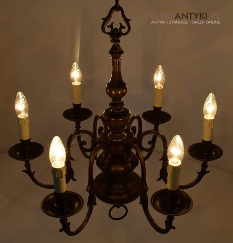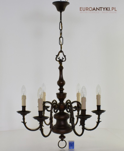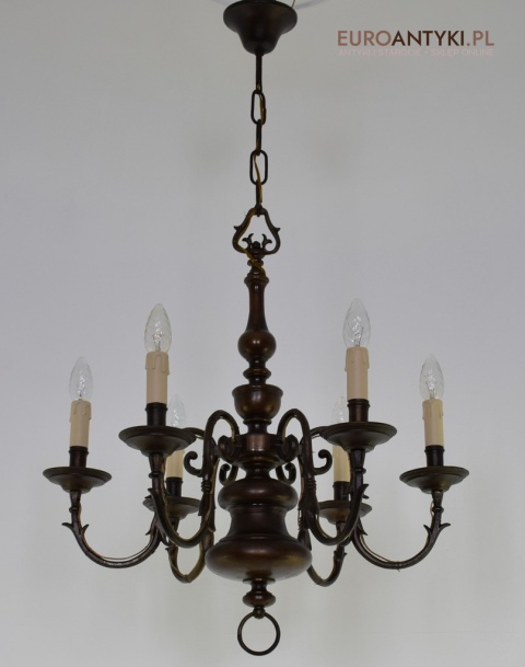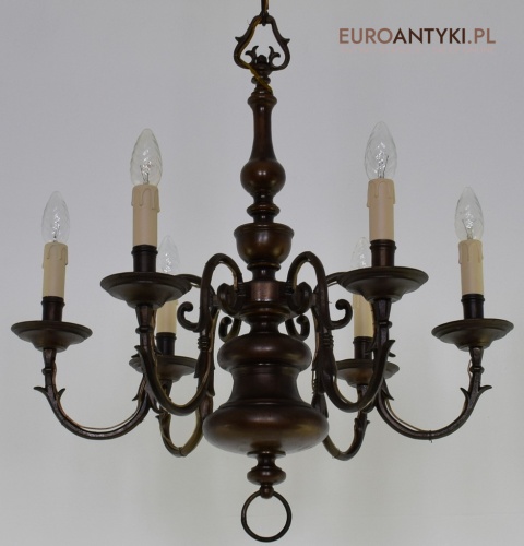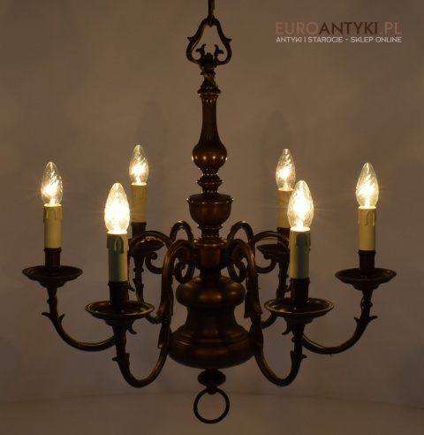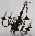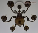 Ten antyczny żyrandol to prawdziwa perełka dla miłośników klasyki i unikalnych przedmiotów. Wykonany z brązu ( 9kg!!! ), pochodzi z Francji i datowany jest na połowę ubiegłego wieku. Jego oryginalne wykonanie oraz ślady patyny nadają mu niepowtarzalnego charakteru. Gilzy wymienione na nowe w stylu vintage / retro.