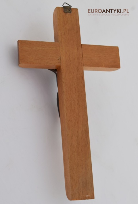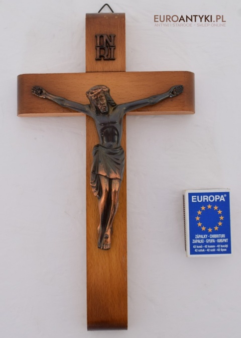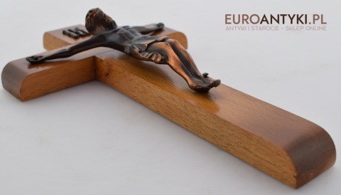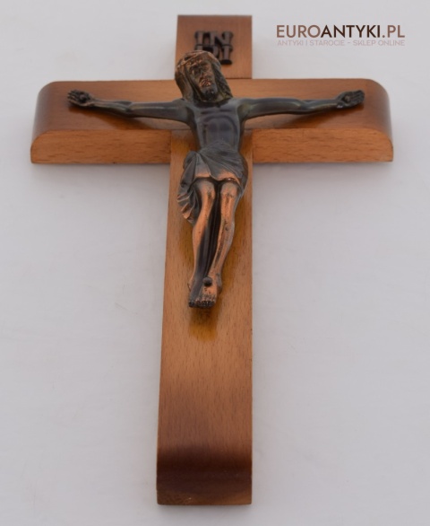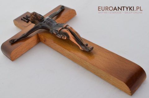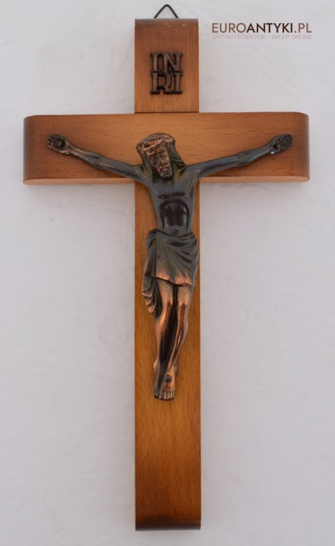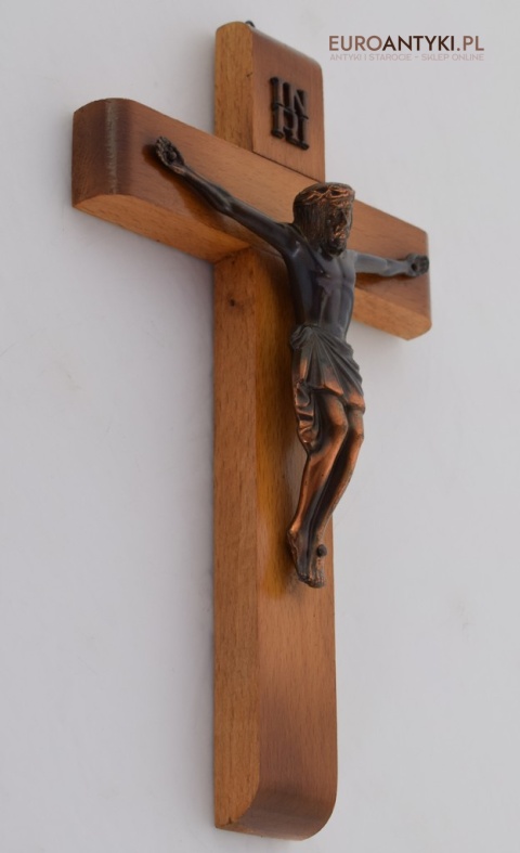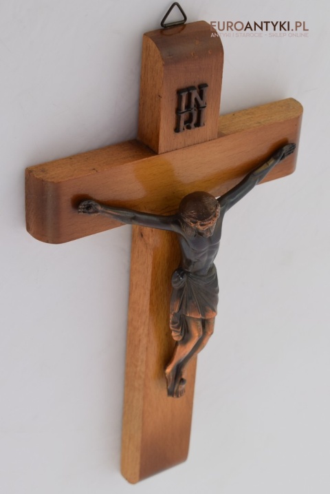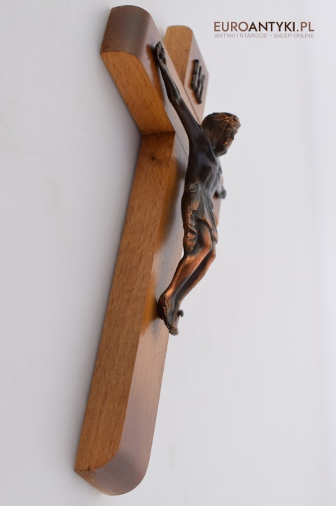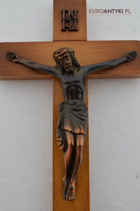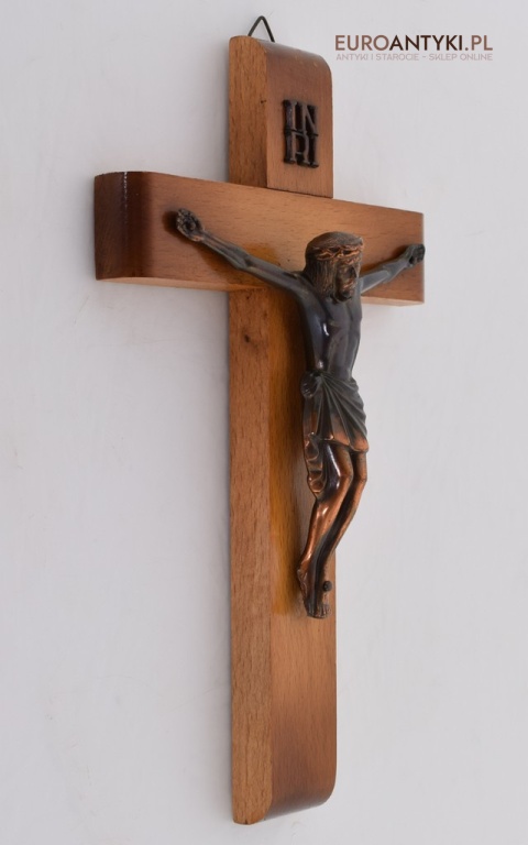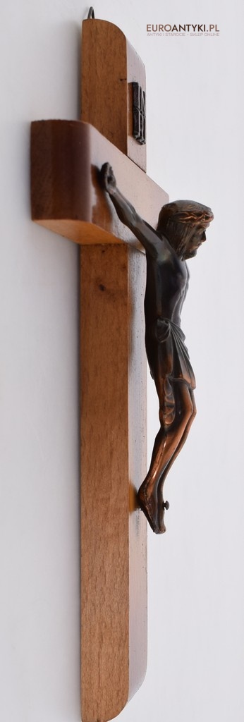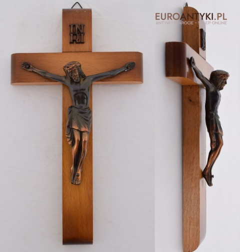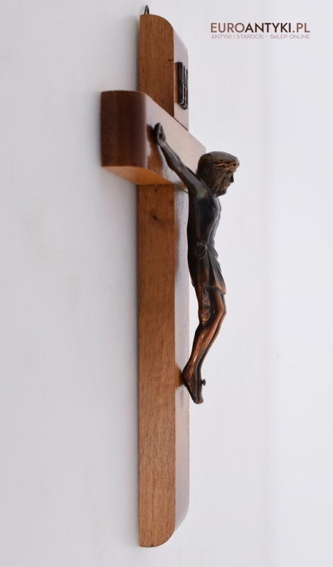 Oferowany krucyfiks ścienny to piękny przykład klasycznego sakralnego stylu w klimacie ART DECO. Wykonany z wysokiej jakości drewna, z centralnie umieszczoną postacią Chrystusa odlaną z brązu. Rzeźba wyróżnia się starannością detali, podkreślając delikatność twarzy oraz dynamikę ciała. Na górnej części krzyża znajduje się inskrypcja INRI, co dodatkowo nadaje całości charakteru i głębokiego znaczenia religijnego. Importowany z Francji - pochodzi z połowy XX wieku.