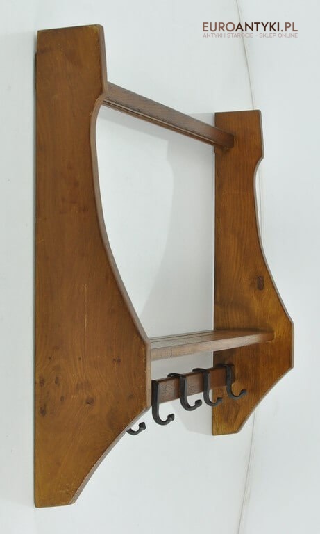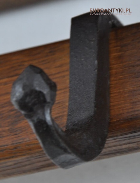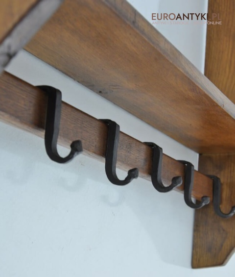 Ascetyczna półeczka wykonana z litego drewna. Ciekawostką są haki, które zostały ręcznie wykute.