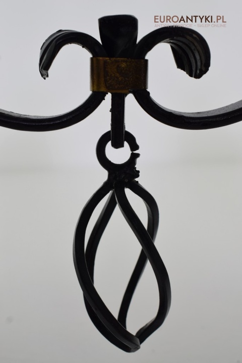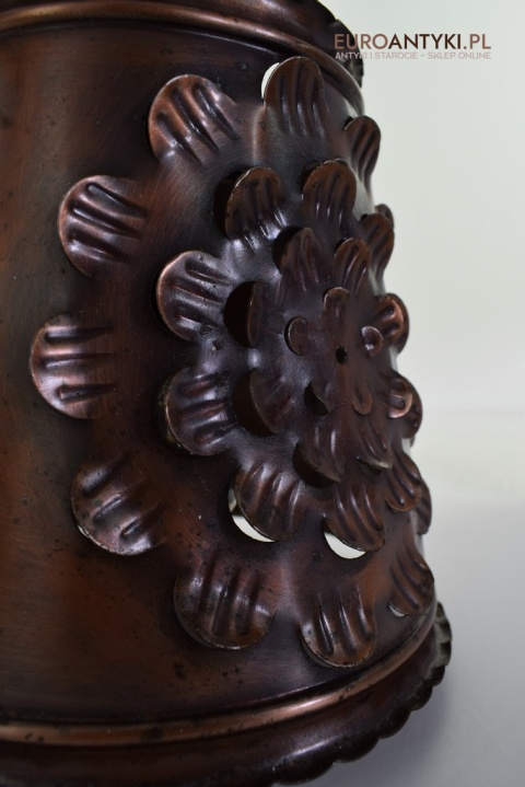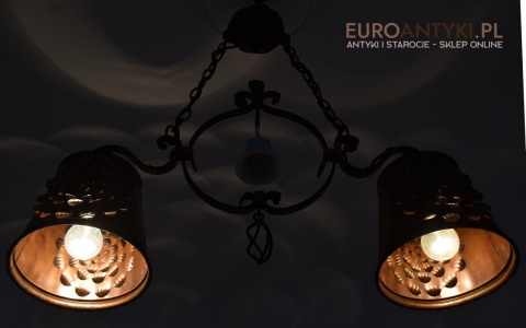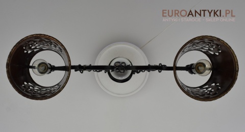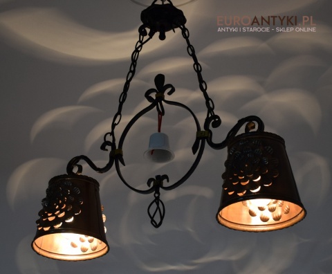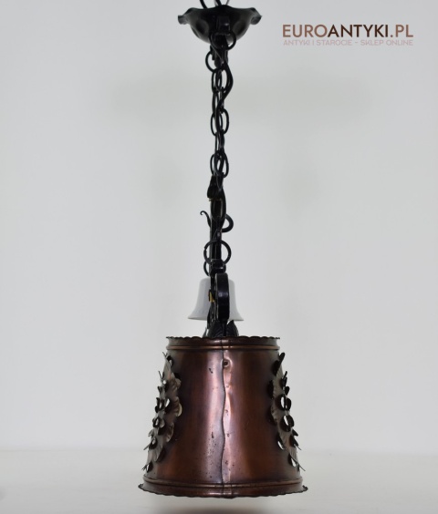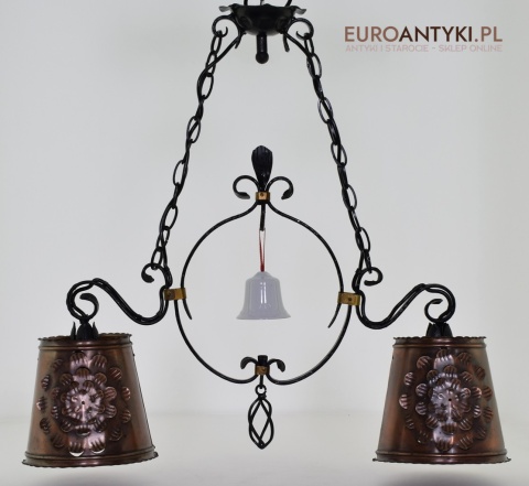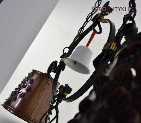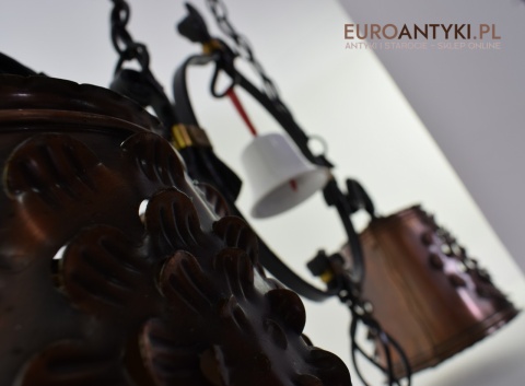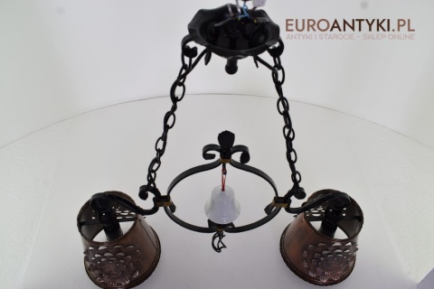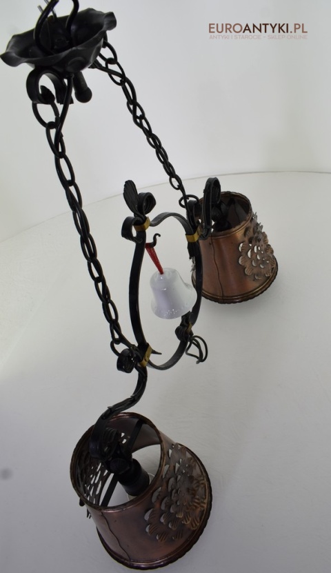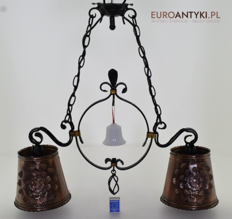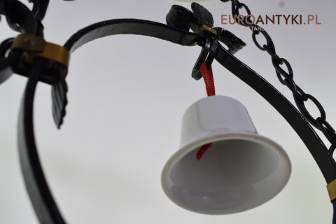 Wykonany z masywnego metalu + klosze ( abażury ) z tłoczonej miedzi. Porcelanowy dzwoneczek jako ozdoba w centrum żyrandola.