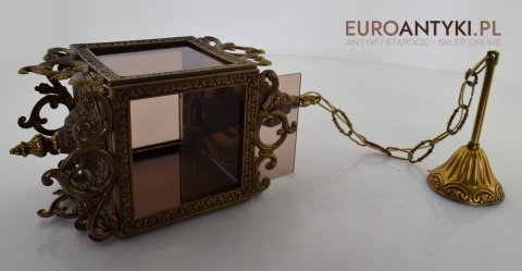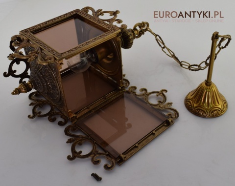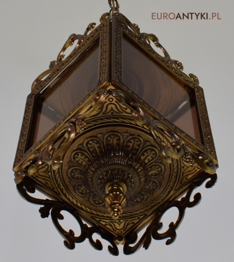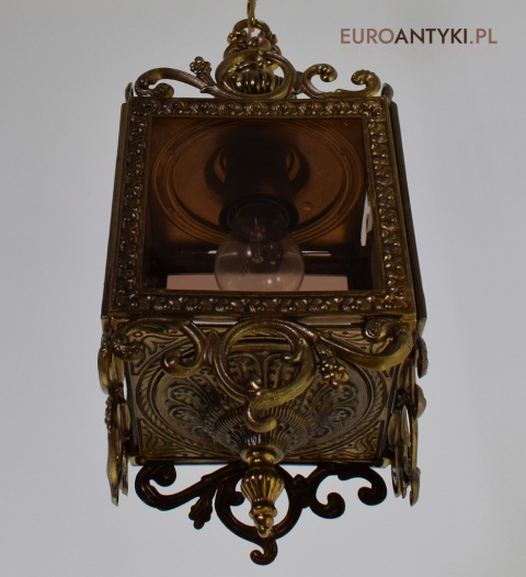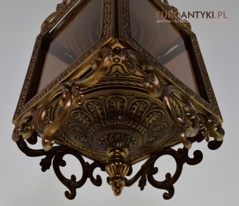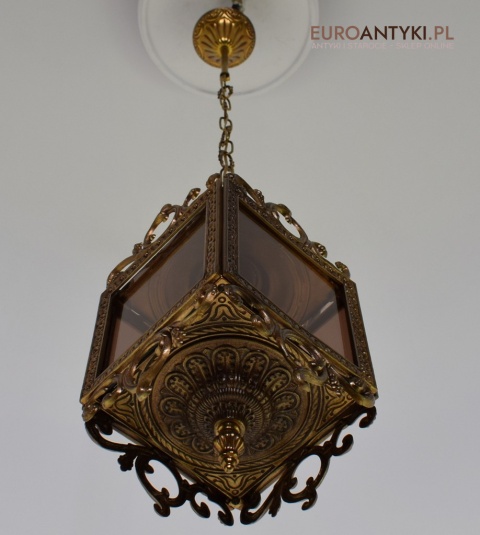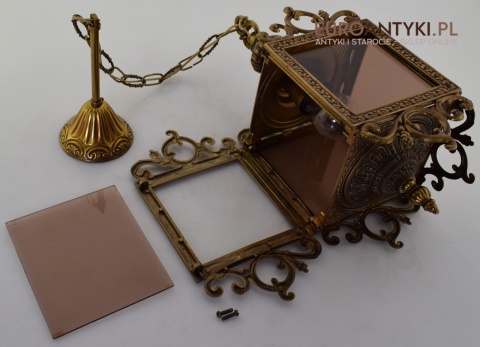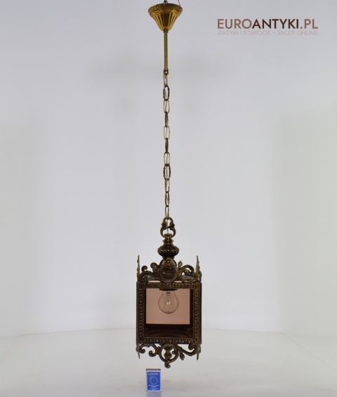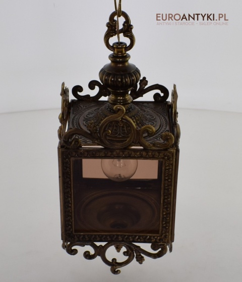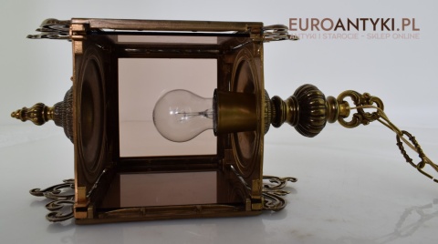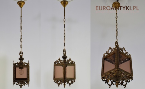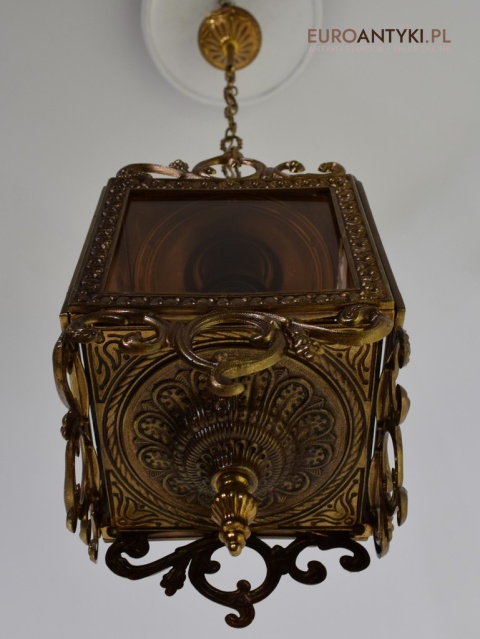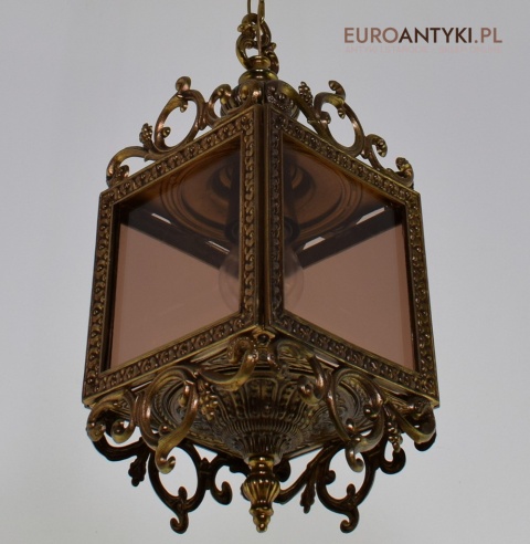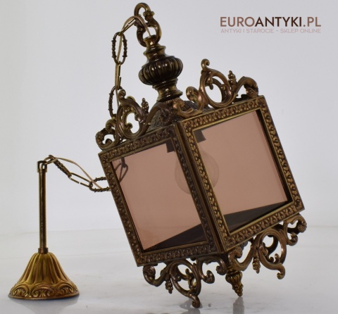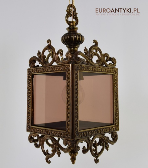 Wyjątkowa i elegancka bogata mosiężna lampa wisząca to doskonały wybór do dekoracji ganku, holu czy nawet łazienki. Ta antyczna lampa sufitowa z mosiądzu została sprowadzona bezpośrednio z Francji i jest w idealnym stanie. Szybki szklane lekko przyciemniane - w idealnym stanie. Wolisz zwykłe jasne szybki? Wymienimy ci gratisowo w ciągu kilku dni.