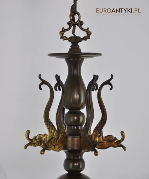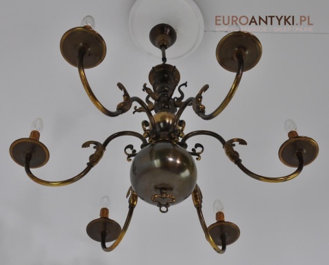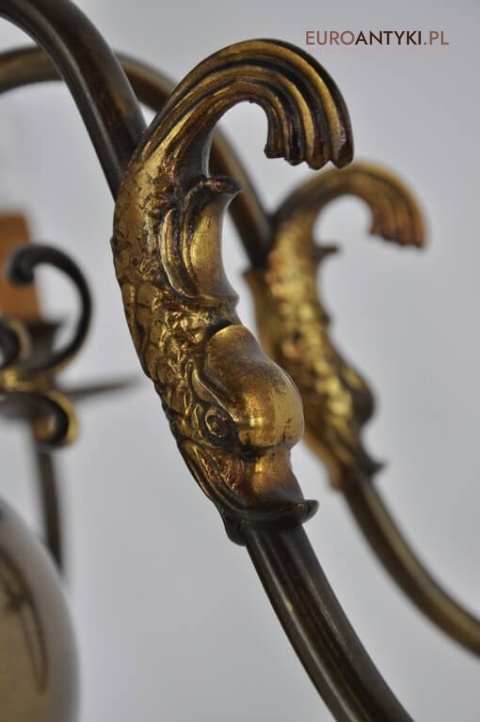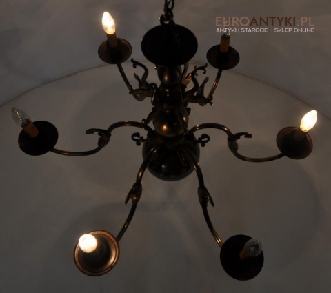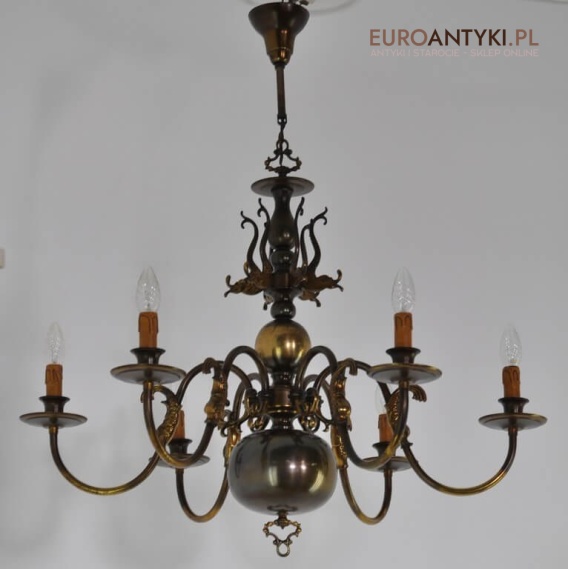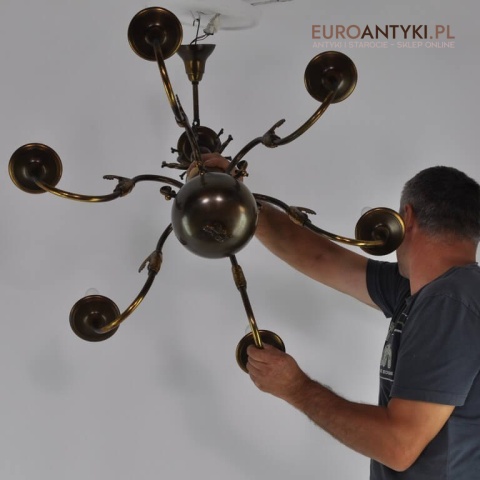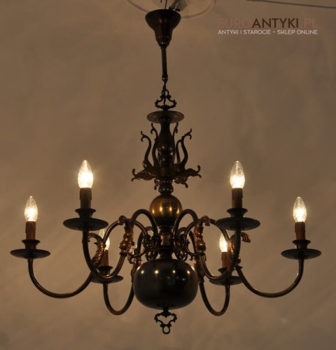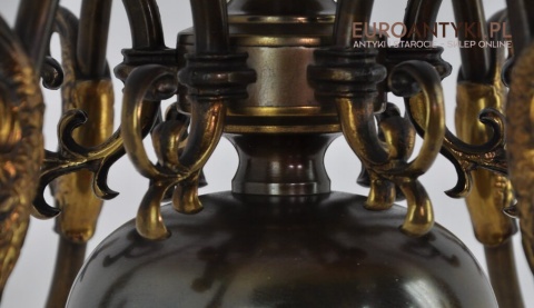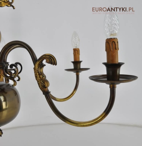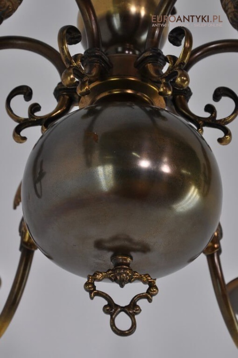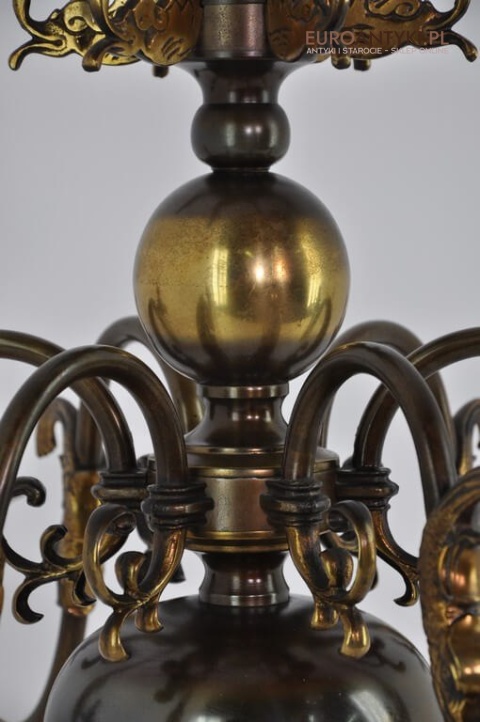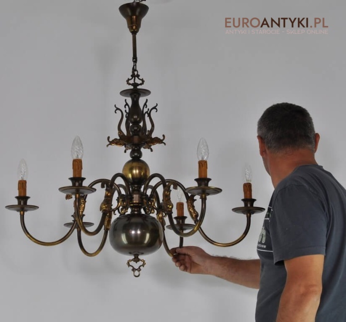 Pięknie wykonany masywny stary żyrandol w stylu chippendale. Dbałość o detale to duży plus tego żyrandola.