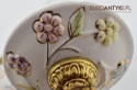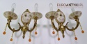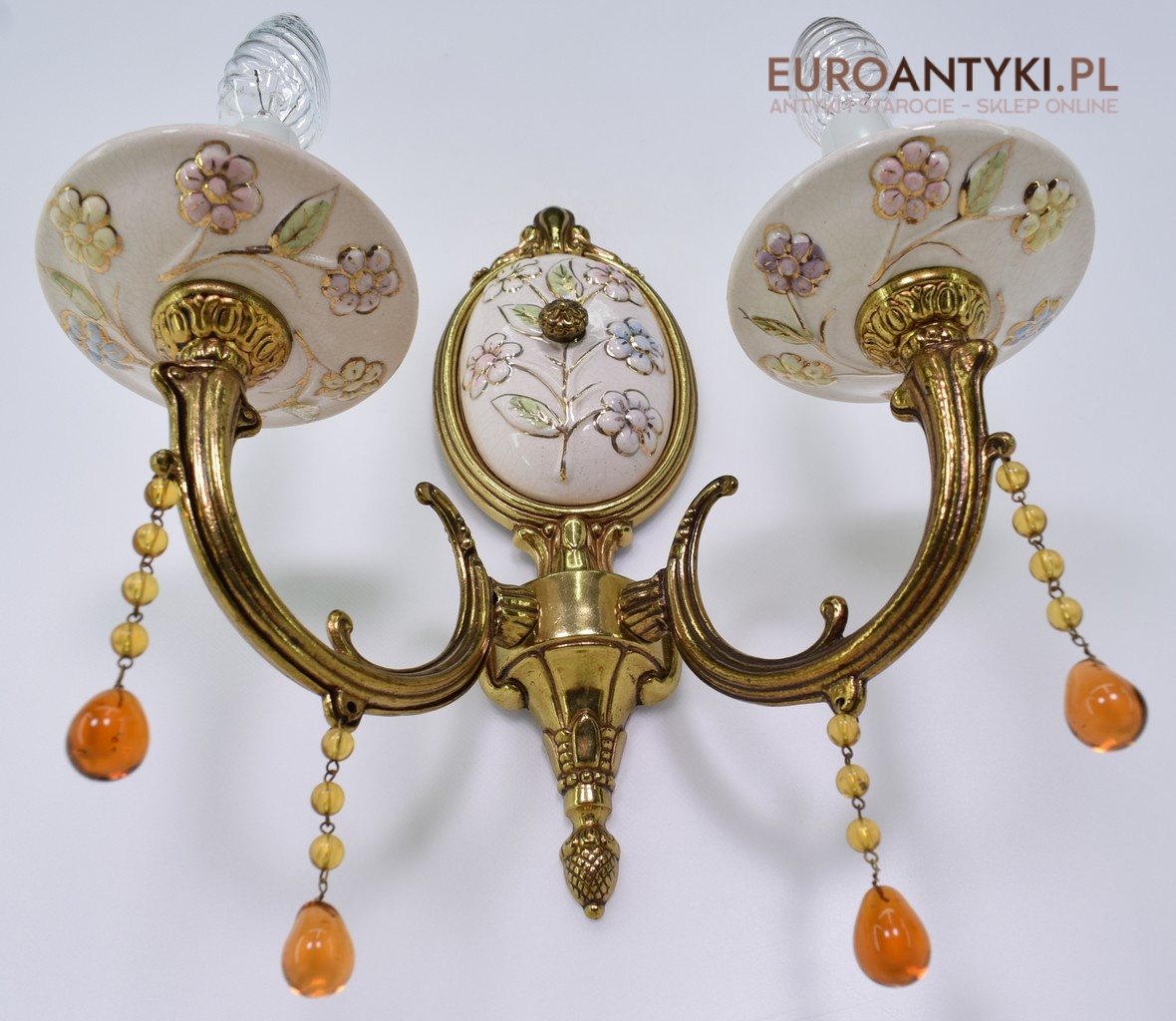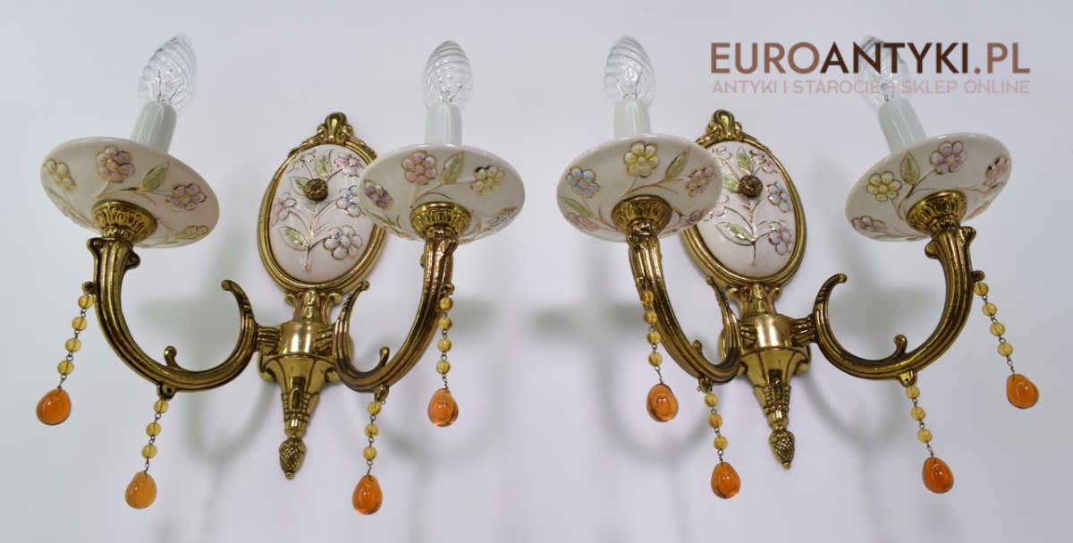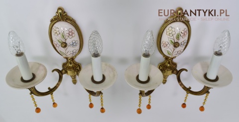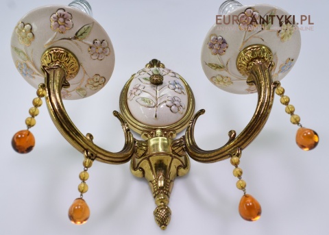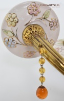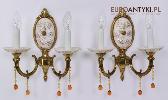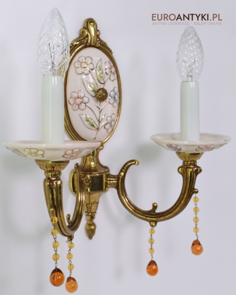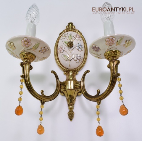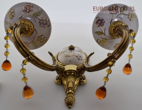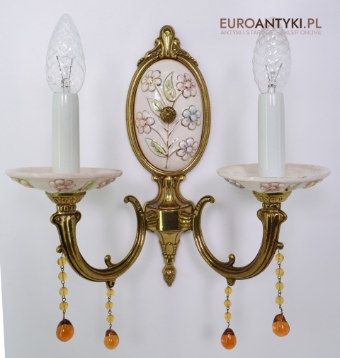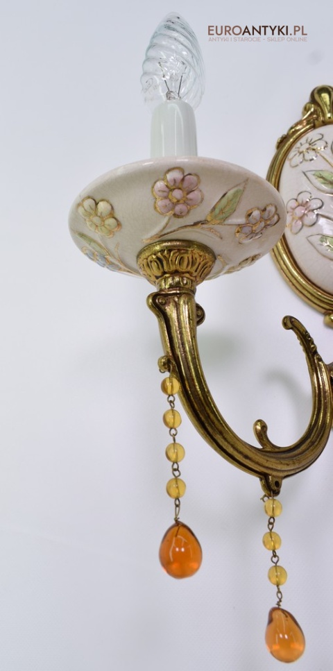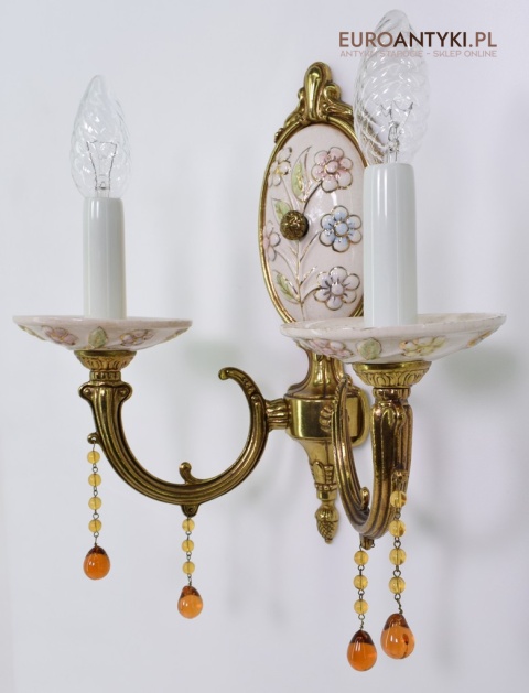 Śliczne, duże kinkiety porcelanowe z Francji, pochodzące z połowy XX wieku. Wykonane z mosiądzu i ręcznie malowanej porcelany, zdobione delikatnym motywem kwiatowym w pastelowych barwach. U dołu każdego ramienia zwisają szklane kryształki w kolorze bursztynu, które pięknie odbijają światło.