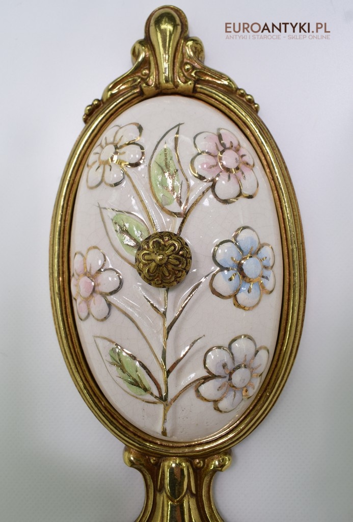 Porcelana i mosiądz zachowane doskonale, z delikatną, naturalną patyną.