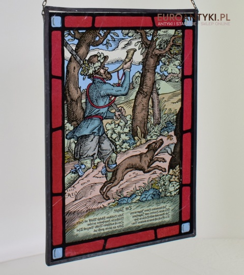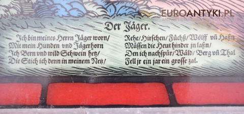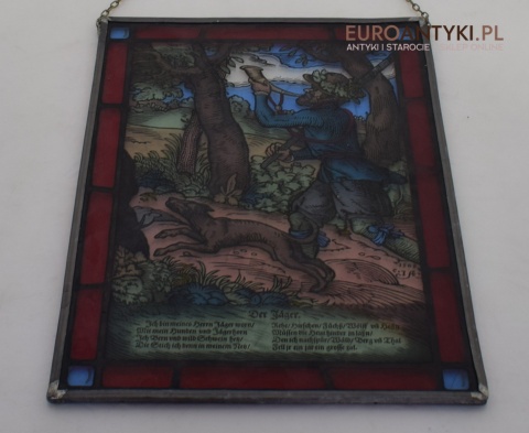 DER JAGER - Myśliwy, witraż szklany niemiecki z motywem polowania.