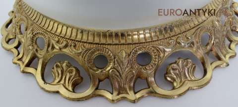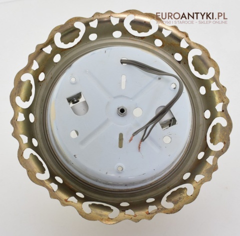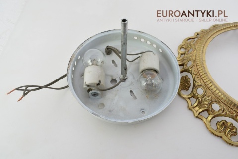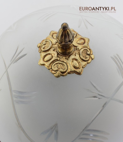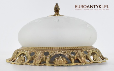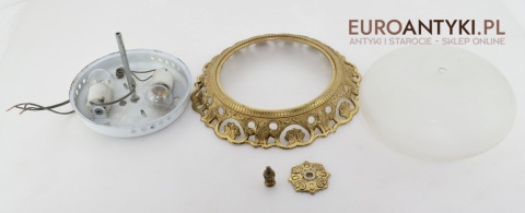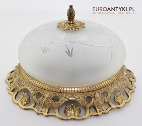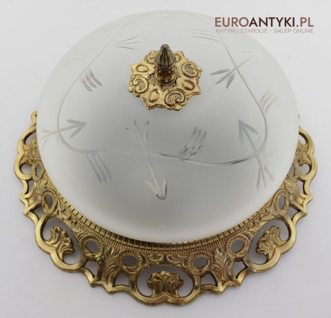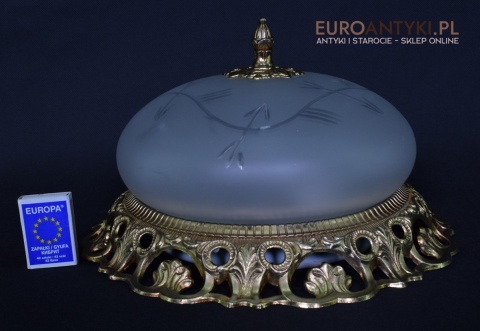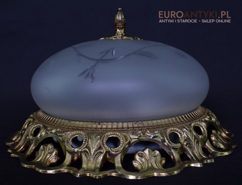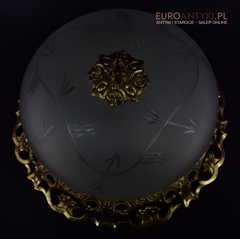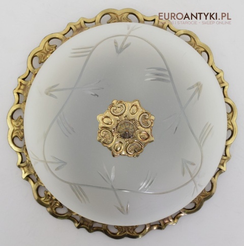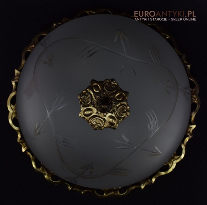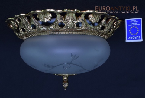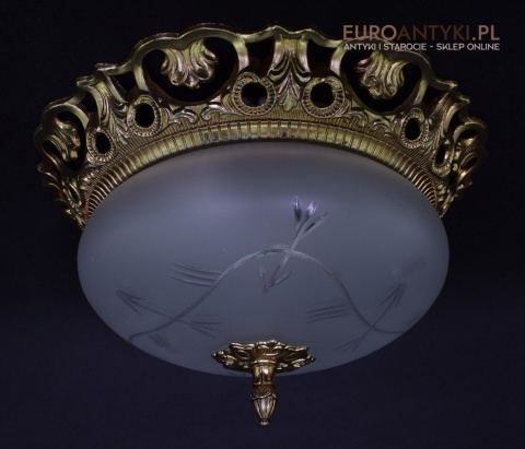Bardzo ładny, dekoracyjny plafon wykonany z metalu mosiądzowanego i szklanego szlifowanego klosza. Sprowadzony z Francji. Pochodzenie datujemy na lata 1970. Stan bardzo dobry , zarówno klosz jak i pierścień. Na powierzchni mosiądzowanej widoczne znaki starości, czyli nalot / patyna. Elektryka sprawna. 2 standardowe gniazda na żarówki E27 o maksymalnej mocy 80 watt każda. Wszystkie plafony i plafoniery wysyłamy bez żarówek.