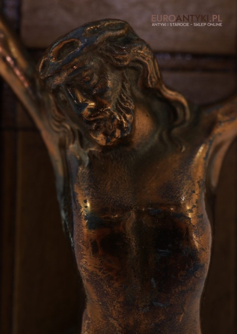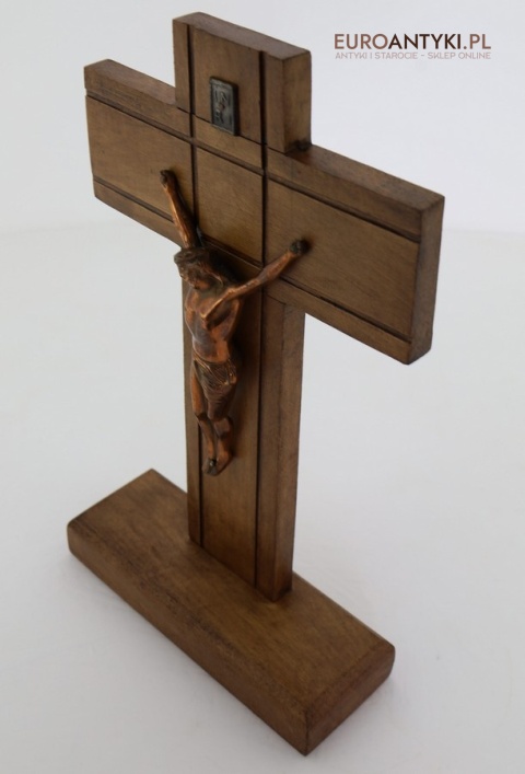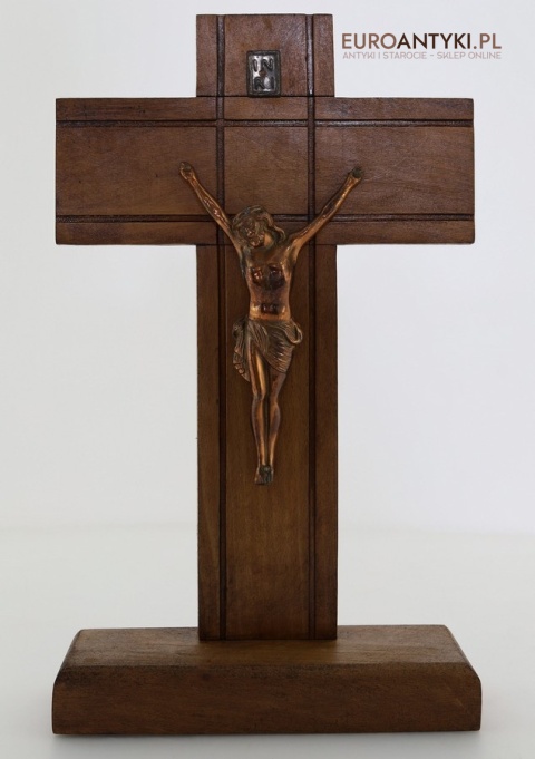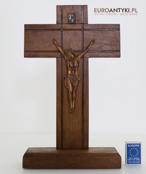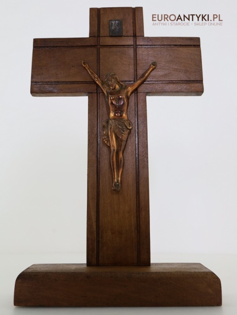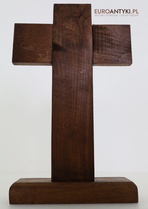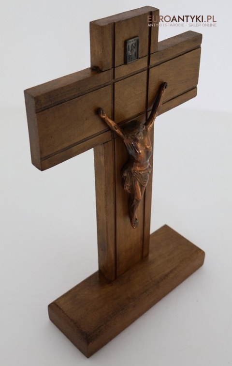 Krzyż został wykonany z litego drewna, co gwarantuje trwałość i solidność – obecnie rzadko stosuje się takie materiały z uwagi na wysoką cenę. Figura Jezusa i tabliczka INRI zostały wykonane z odlewanego metalu, pokrytego stylową patyną. Całość wykonana niezwykle starannie, co świadczy o kunszcie rzemieślniczym. To przedmiot z duszą i historią, który wyróżnia się na tle współczesnych replik.