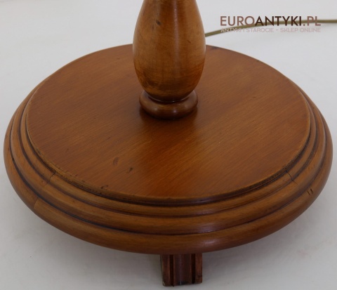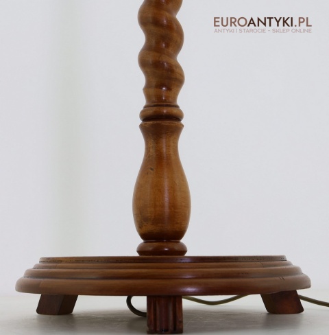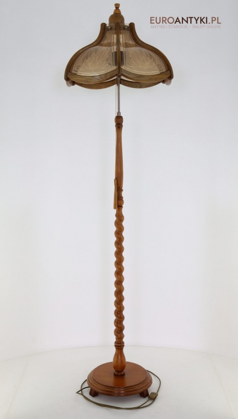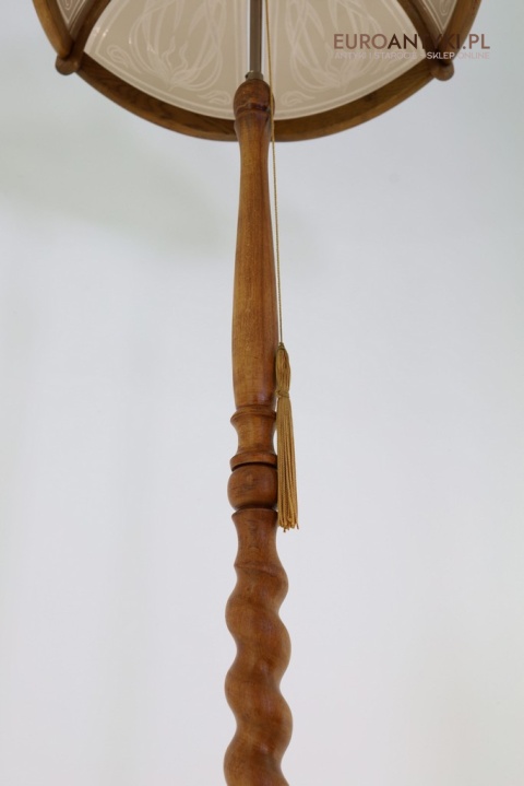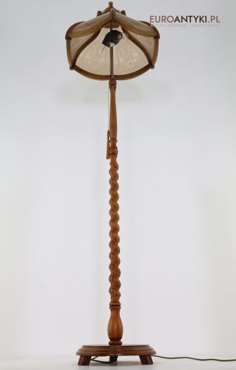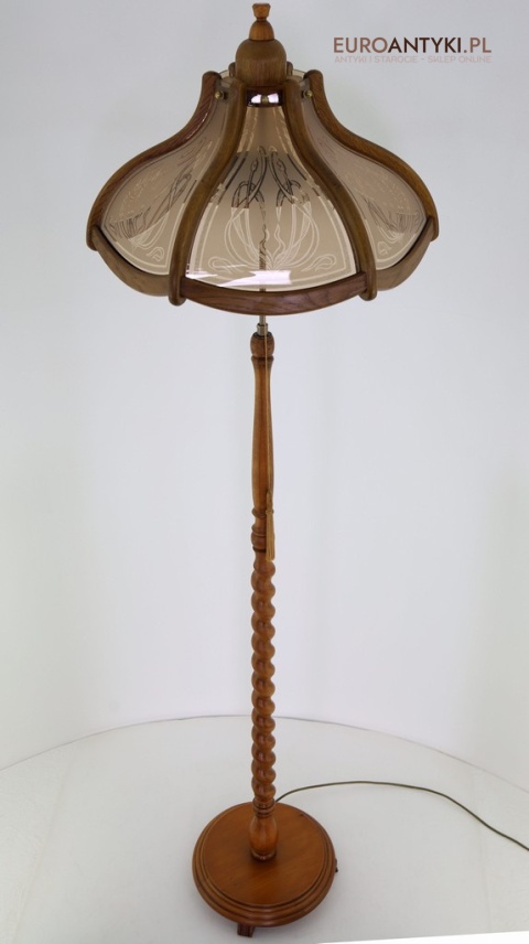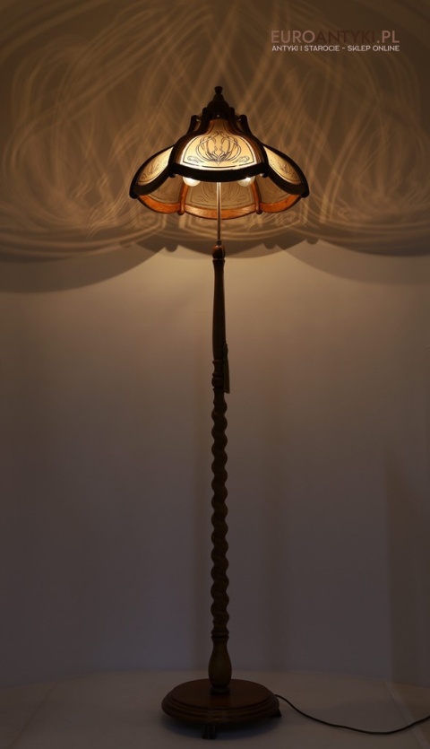 Prezentujemy dużą lampę podłogową, wykonaną z litego drewna, zachwycającą klasycznym stylem i wyjątkowym rzemiosłem. Klosz lampy to połączenie drewna i szklanych szybek, ozdobionych pięknymi motywami secesyjnymi, które nadają jej niepowtarzalny charakter. Piękne efekty świetlne na ścianie i suficie - co widać na zdjęciach. Lampa stoi bardzo stabilnie poniewaz ma dużą masywną stope. Sprowadzona z Francji, pochodzi z drugiej połowy XX wieku. Lampa po renowacji.
