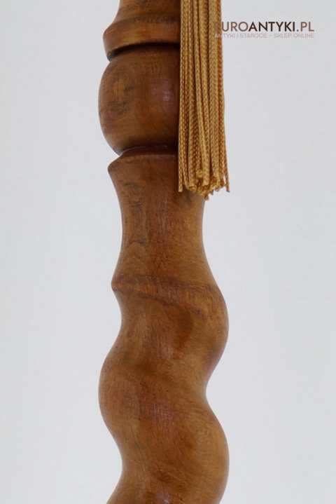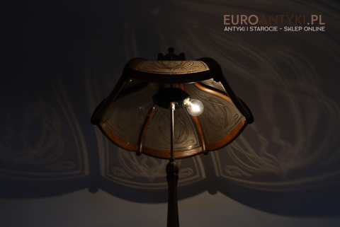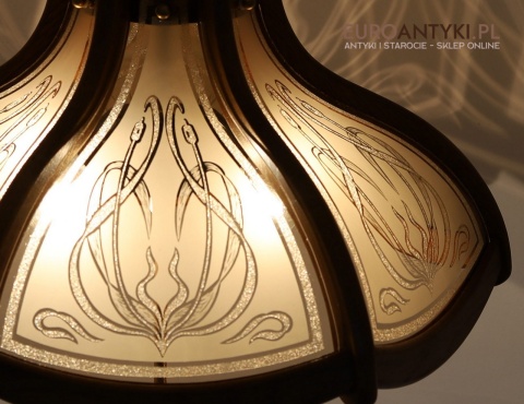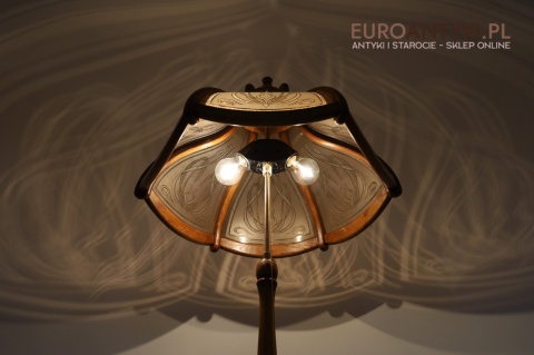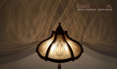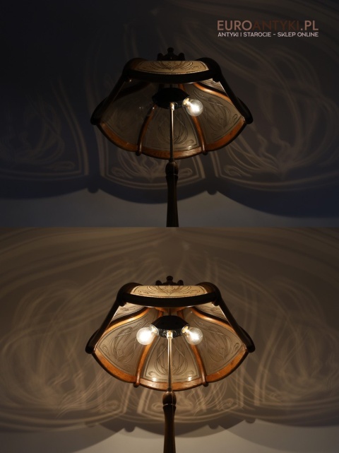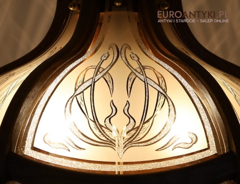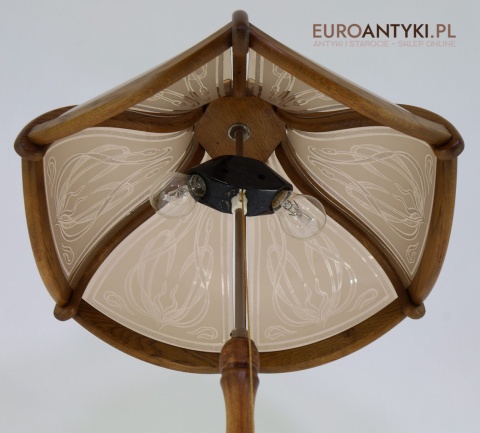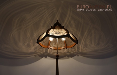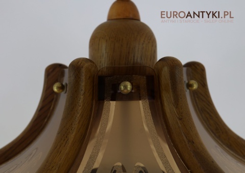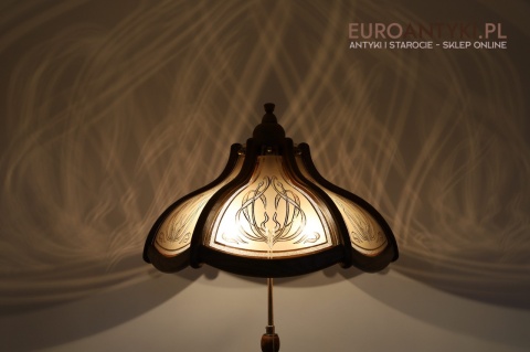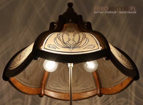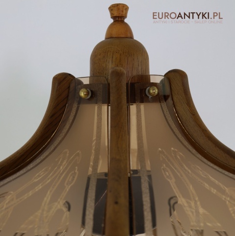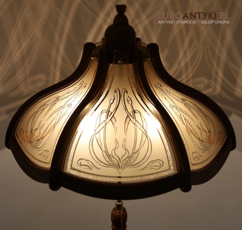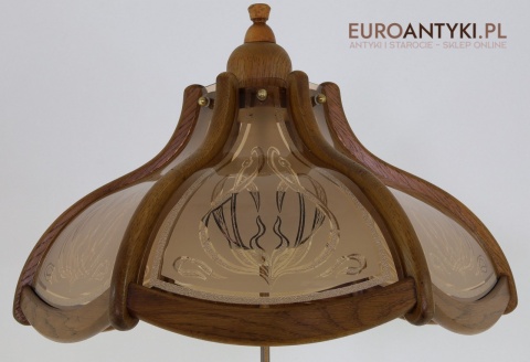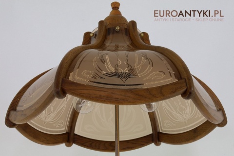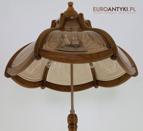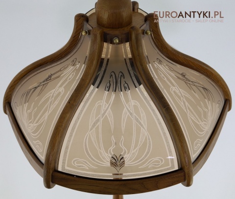 - Materiał: lite drewno (podstawa i klosz) oraz szkło z misternym zdobieniem w stylu secesyjnym,