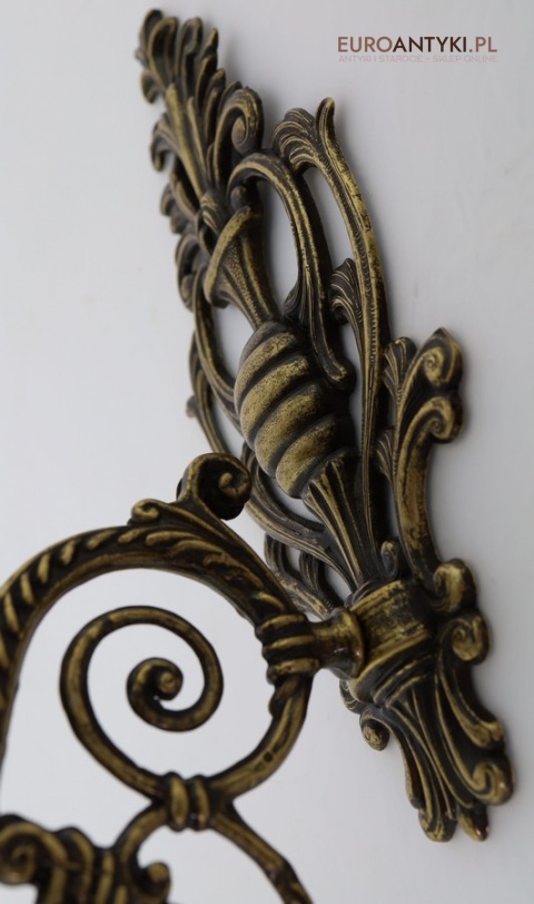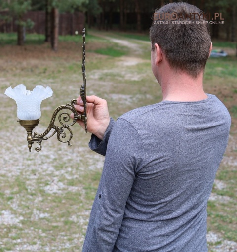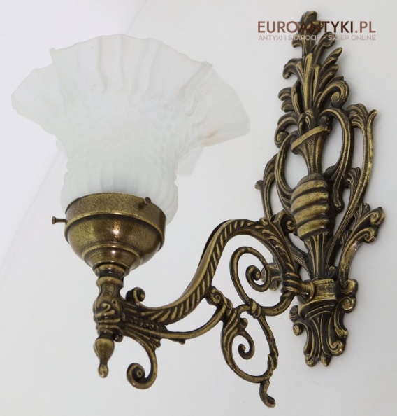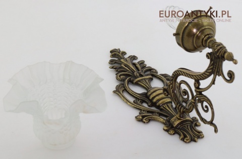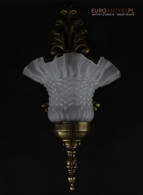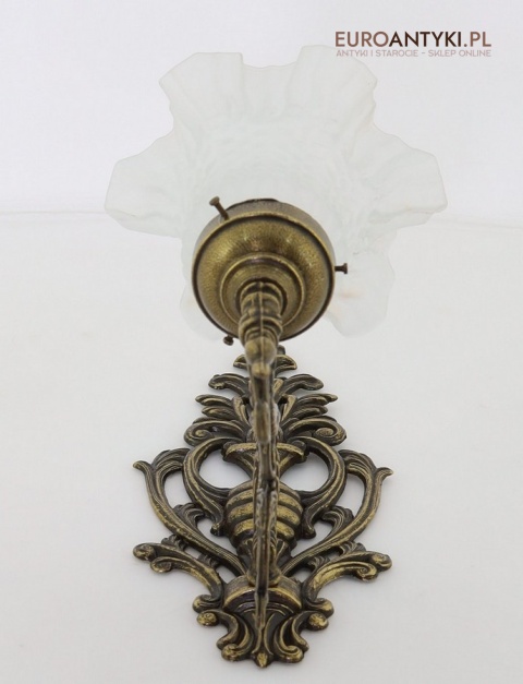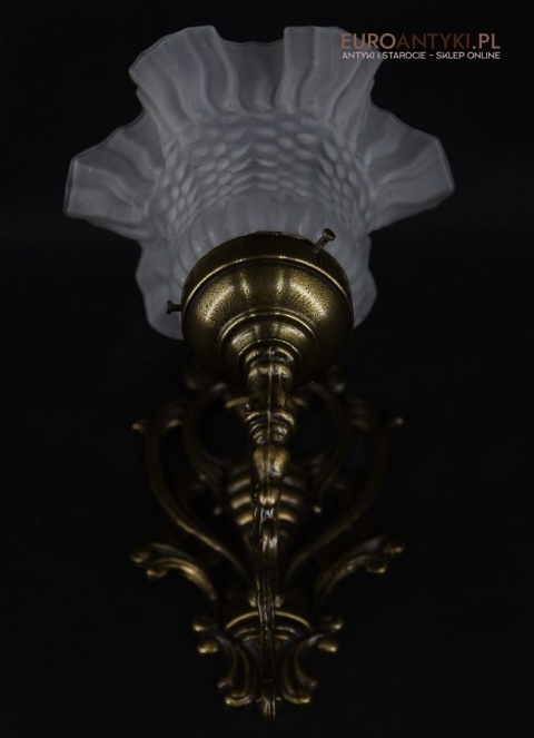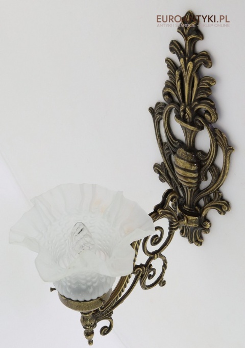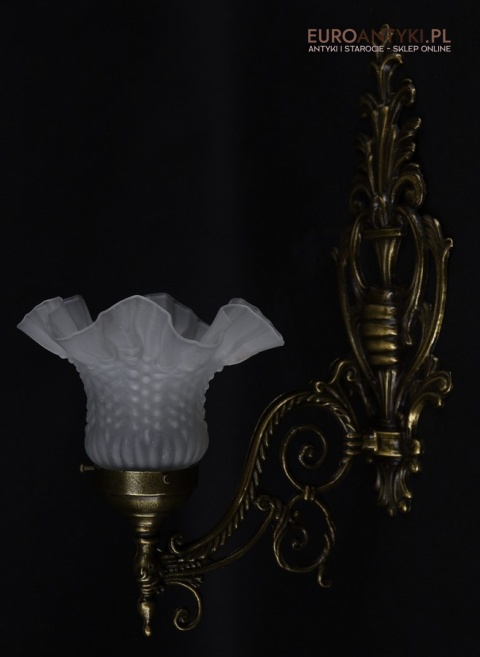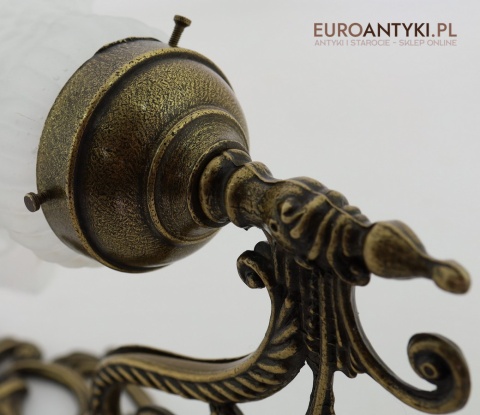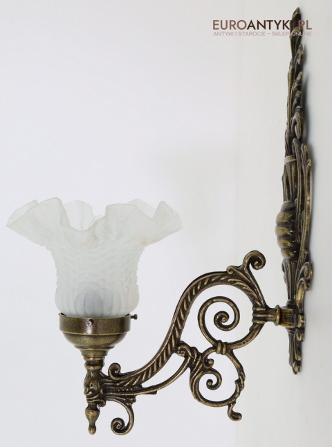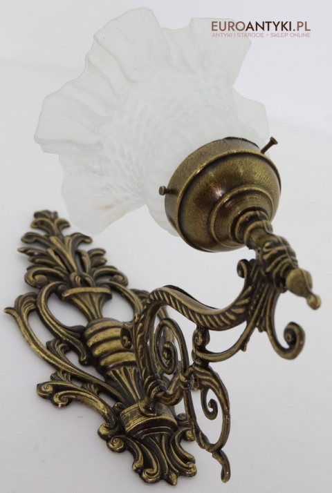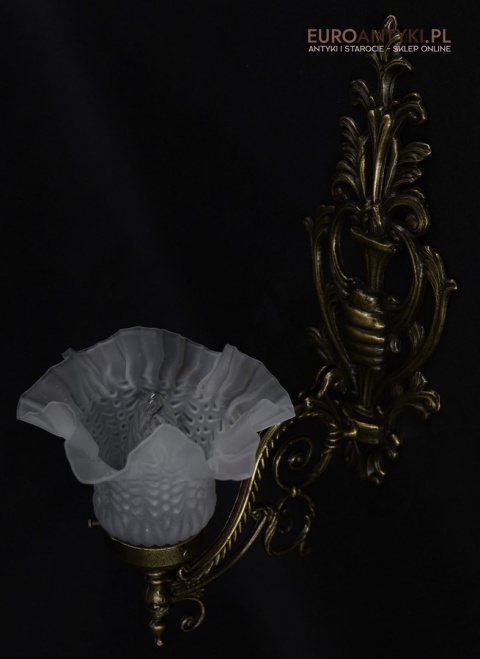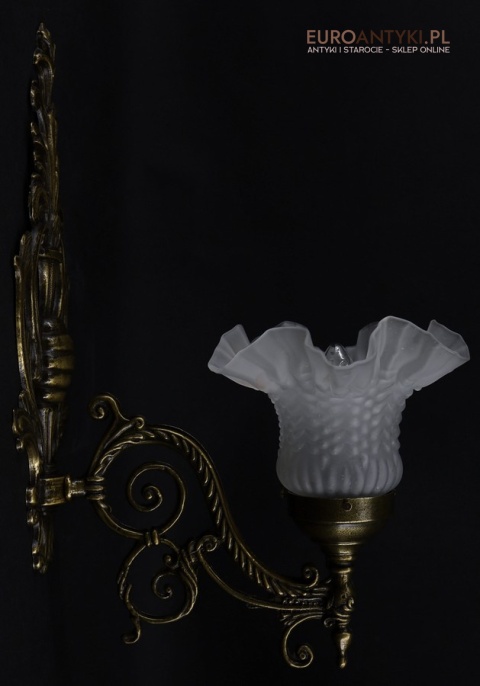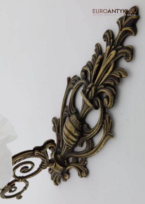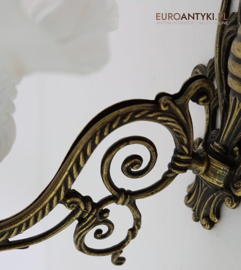 Ten antyczny kinkiet zachwyca bogatym, ornamentalnym wzornictwem – typowym dla stylu klasycystycznego, który czerpie inspiracje z epoki baroku i rokoko. Wyjątkowo dekoracyjna rozeta i ozdobne ramię wykonane są z ciężkiego, złoconego mosiądzu, z pięknymi, roślinnymi zdobieniami i spiralami. Klosz z matowego szkła w kształcie rozwiniętego kwiatu nadaje mu elegancji i delikatności.