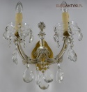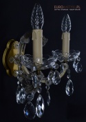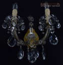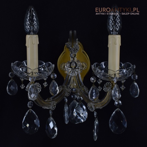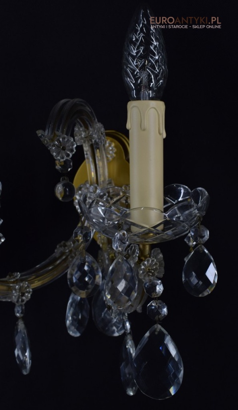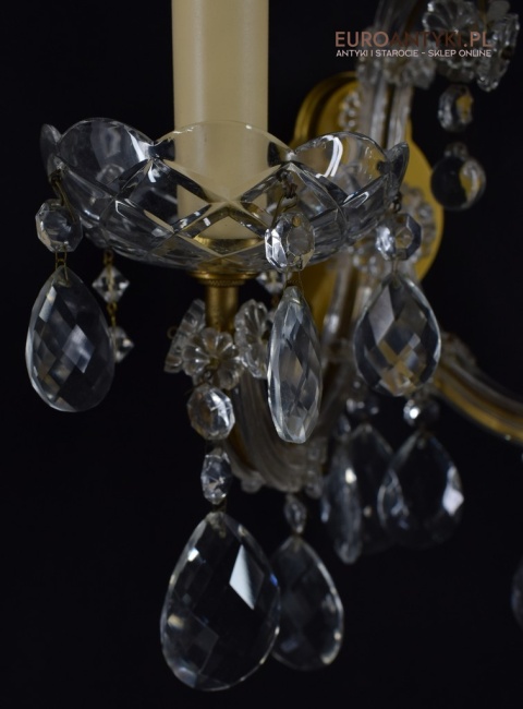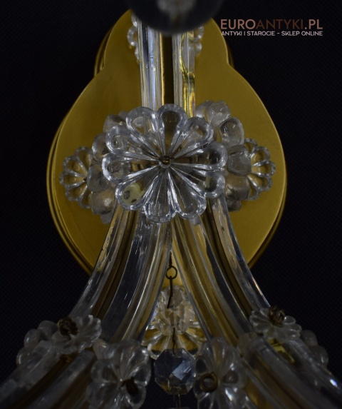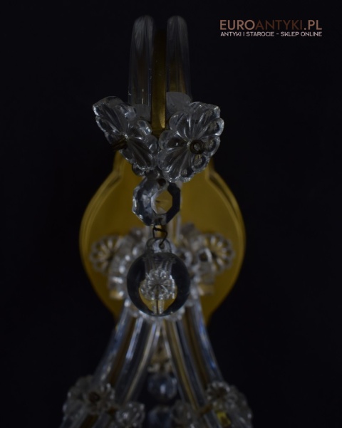 Sprowadzony z Austrii. Pochodzi z połowy XX wieku. Wykonany z mosiądzu, szkła + prawdziwe kryształowe zawieszki. Kryształy są wyjątkowo piękne i ślicznie mienią się gdy pada na nie światło, szkoda że zdjęcia nie ukazują tego pokazu iluminacji, bo naprawdę jest na co popatrzeć. Kryształy kompletne i w bardzo dobrym stanie. Nie poobijanie, nie klejone, nie pokruszone. 100% kompletne.